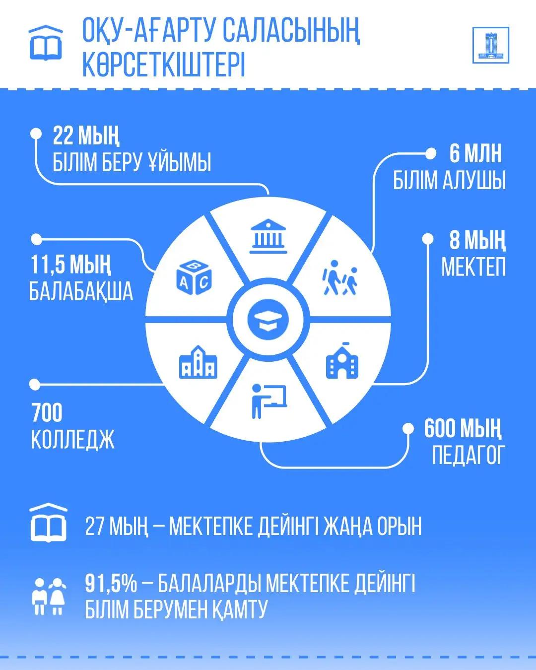 Бірінші жартыжылдықта 27 мыңға жуық жаңа мектепке дейінгі орындар ашылды, бұл – балаларды сапалы мектепке дейінгі тәрбиемен және оқытумен қамтуды 91,5%-ға дейін ұлғайтуға ықпал етті. Қалалар мен ауылдық жерлер арасындағы білім беру мүмкіндіктеріндегі алшақтықты азайту үшін жаңа оқушы орындары енгізілуде, жыл сайын 1 мың ауыл мектебі жаңғыртылады және роботты техника, химия, биология, физика және STEM-зертханалар бойынша заманауи пәндік кабинеттер сатып алынады.