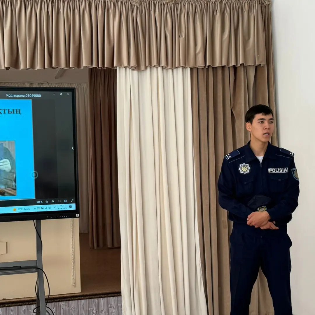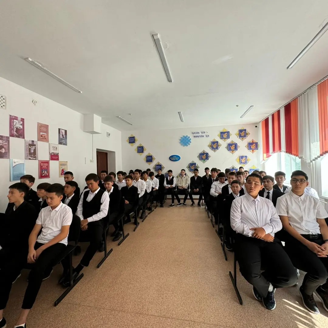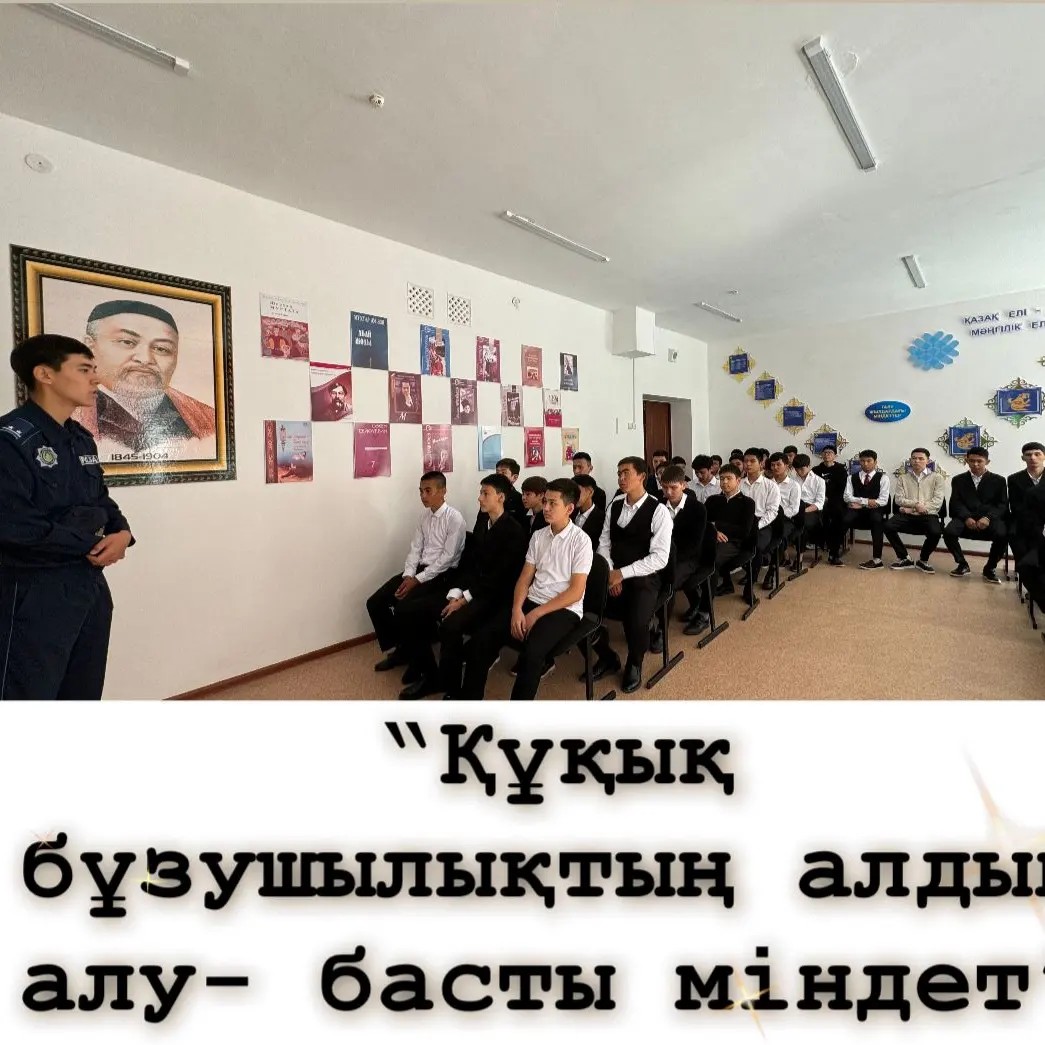 3 қыркүйек күні, мектебімізде полиция лейтенант Сағидан Шаттық Байшуақұлы мектептің тәрбие ісі жөніндегі орынбаслары Дауылбаева Ж.С., Өтепова А.Б. балалар мен жасөспірімдер арасындағы құқық бұзушылықтың алдын-алу, кәмелетке толмағандар арасындағы қылмыстың өсуіне жол бермеу мақсатында 9-11 сынып оқушылары арасында түсіндірме жұмыстарын жүргізді. Жиналыс барысында «құқық бұзушылық», «буллинг» терминіне түсініктеме беріліп, оның түрлері мен зардаптары жайлы айтылды. Құқық бұзушылықтың алдын алу бойынша оқушыларға кеңестер берілді. Сонымен қатар оқушыларға есірткі заттарының, ішімдік ішу мен темекі тартудың, нашақорлықтың жас ағзаға тигізер зиянды әсері, өкінішке ұрындырар, келешек өмірлеріне келтірер кесапаты туралы түсінік берді.