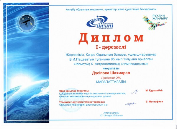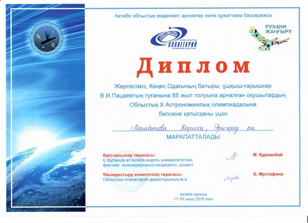 Облыстық Х Астрономиялық олимпиадасында мектебіміздің оқушылары жүлделі орындарға ие болды. 9 «А» класс оқушысы Дүсіпова Ш. І орын, Мамбетова Д. диплом, Жетекшісі Қожанова Ә.Ж. 7 «б» класс оқушысы Орлова В. ІІІ орын, 8 «Б» класс оқушысы Киченок А. ІІІ орын. Жетекшісі Казбаев Д.Н.