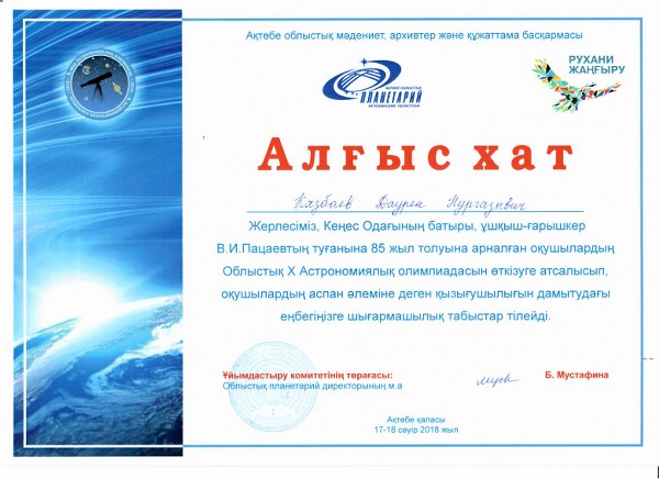 Байқауды ұйымдастырып, өткізген Ақтөбе облыстық планетарий ұжымына алғысымызды білдіреміз! Ұрпағымыз білімді, келешегіміз кемелді болсын!