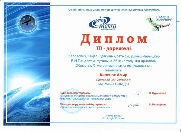Облыс əкімі Б.М.Сапарбаевтың бастамасымен бастау алған "Бақытты бала-мəңгілік ел кепілі" жобасы аясында 17 cəуір күні Облыстық планетарийде жерлес, ұшқыш-ғарышкер В.И.Пацаевтың 85 жылдығына арналған Облыстық Х Астрономиялық олимпиадасы өткізілді.