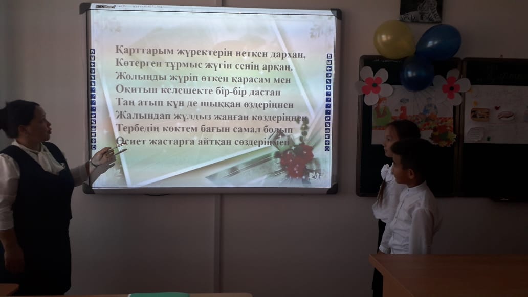 Ақтөбе қаласындағы Пригород орта мектебінде халықаралық қарттар күніне орай іс - шара ұйымдастырылды.Мақсат- қарттарды құрметтеу,сыйлау,жас ұрпақтың санасына адамгершілік - рухани тәрбие сіңіру. Нақтырақ айтсақ аталған мектептің 5 ''а'' сынып оқушылары сынып жетекшісі Миргүл Нұрбаевамен бірге ауылдағы тыл ардагері Мапиза Бержанованың үйіне барып,қарияға құрмет көрсетті.Зейнеткерді мерекемен құттықтаған оқушылар Мапиза әжеге гүл шоқтарын ұсынып,арнайы жаттаған тақпақтарын айтып,ән шырқады.Тыл ардагерін ортаға алып,естелікке суретке түсуді де ұмытпады Кейуана балаларға жылы лебізін білдіріп,ақ батасын берді.Бұдан кейін сыныпта "Қарттарым - асыл қазынам" тақырыбында тәрбие сағаты ұйымдастырылды.Оқушылар тақырыпқа байланысты өз қолдарымен дайындаған қабырға газеттерін таныстырып,таным көкжиектерін кеңейтті.