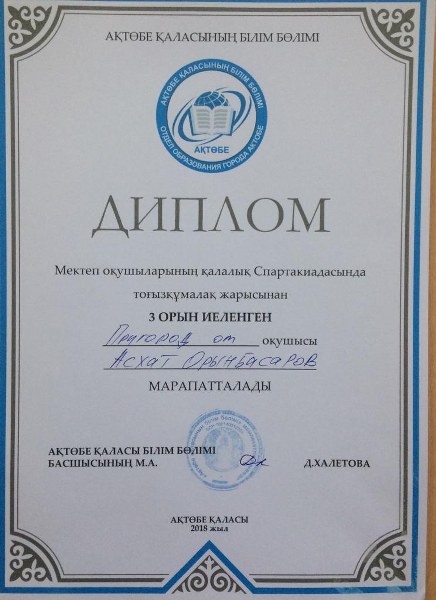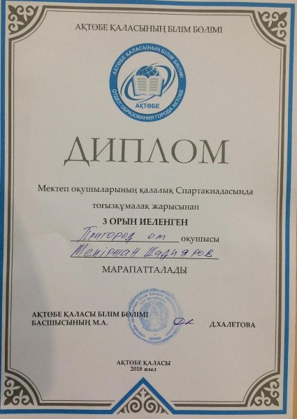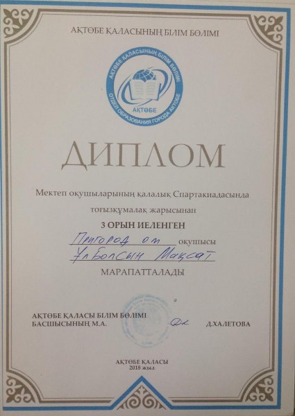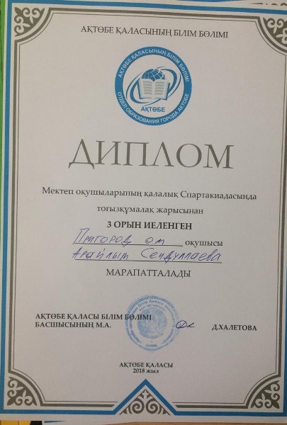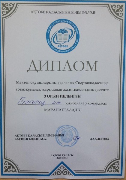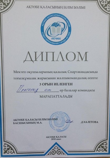 Білім мен спортты серігі еткен оқушыларымыз үшін осы апта жемісті болды. 20 – 23 қараша күндері қала мектептер арасында Спартакиада бағдарламасы бойынша оқушылар арасында тоғызқұмалақ жарысына қатысқан оқушыларымыз жүлделі орындарға ие болды.