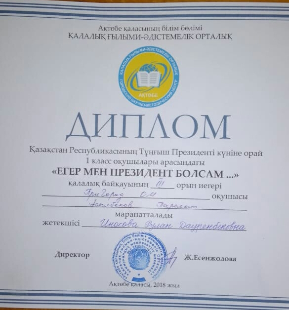 Қазақстан Республикасының Тұңғыш Президенті күніне орай 1 класс оқушылары арасында өткен «Егер мен Президент болсам...» атты қалалық байқауға Асылбеков Парасат қатысып ІІІ дәрежелі дипломмен марапатталды. Жетекшісі: Иносова Рулан Дәуренбековна