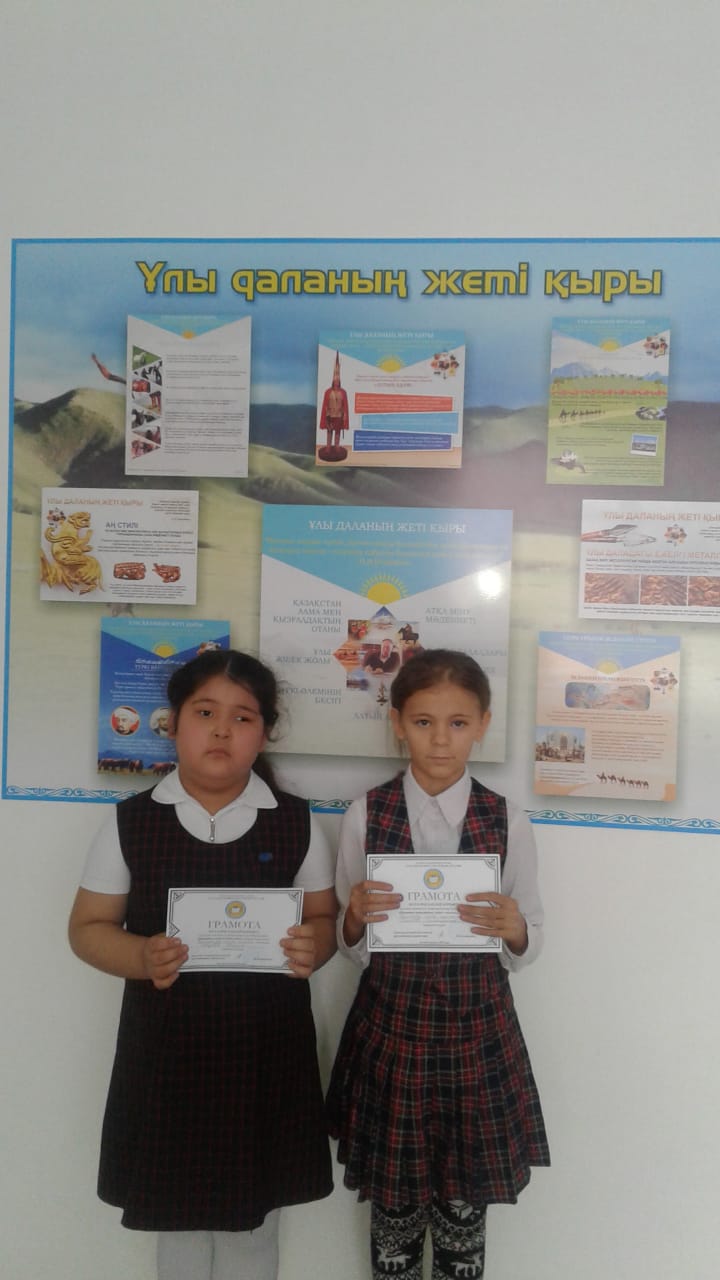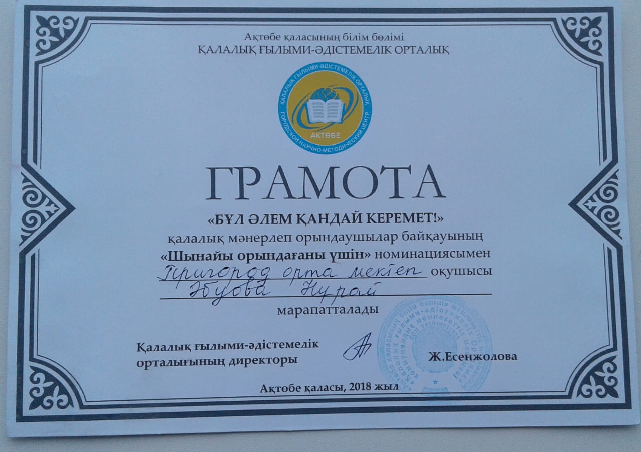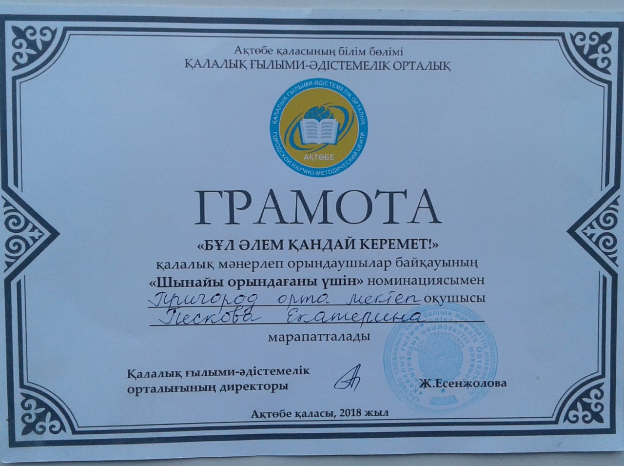 Мектебіміздің 2 «А» класс оқушысы Әбуова Нұрай және 4 «Б» класс оқушысы Пескова Екатерина қалалық ғылыми-әдістемелік орталығының ұйымдастыруымен өткен “Бұл әлем қандай керемет!” қалалық мәнерлеп орындаушылар байқауына қатысып, “Шынайы орындағаны үшін” номинациясымен марапатталды.