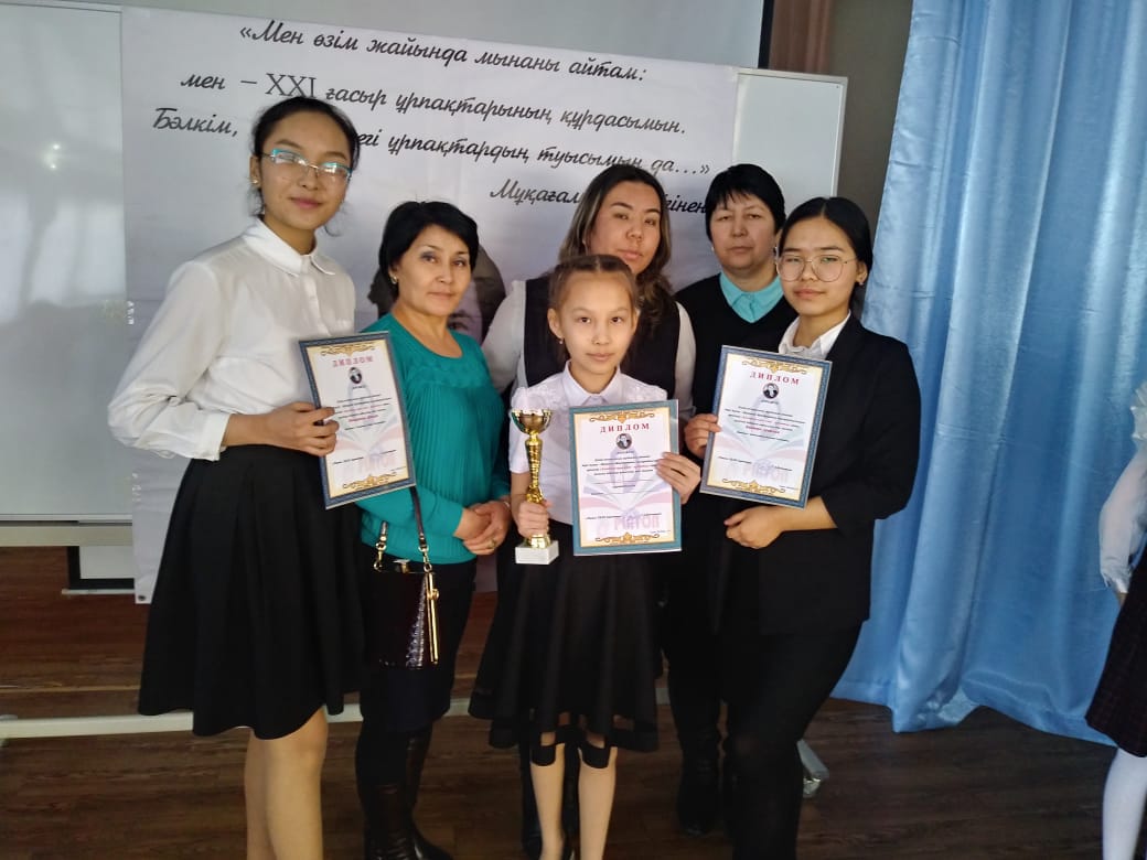 9 «А» класс оқушысы Әділшанова Жансая 2 орын, жетекшісі: Г.Ж.Рахметова; 10 «А» класс оқушысы Байтөре Арайлым 1 орын, жетекшісі: Б.С.Байдовлетова. Байқауға оқушыларын дайындаған жетекшілер мадақтамамен марапатталды. Мектебіміз «Белсенді қатысушы мекеме» кубогімен марапатталды.