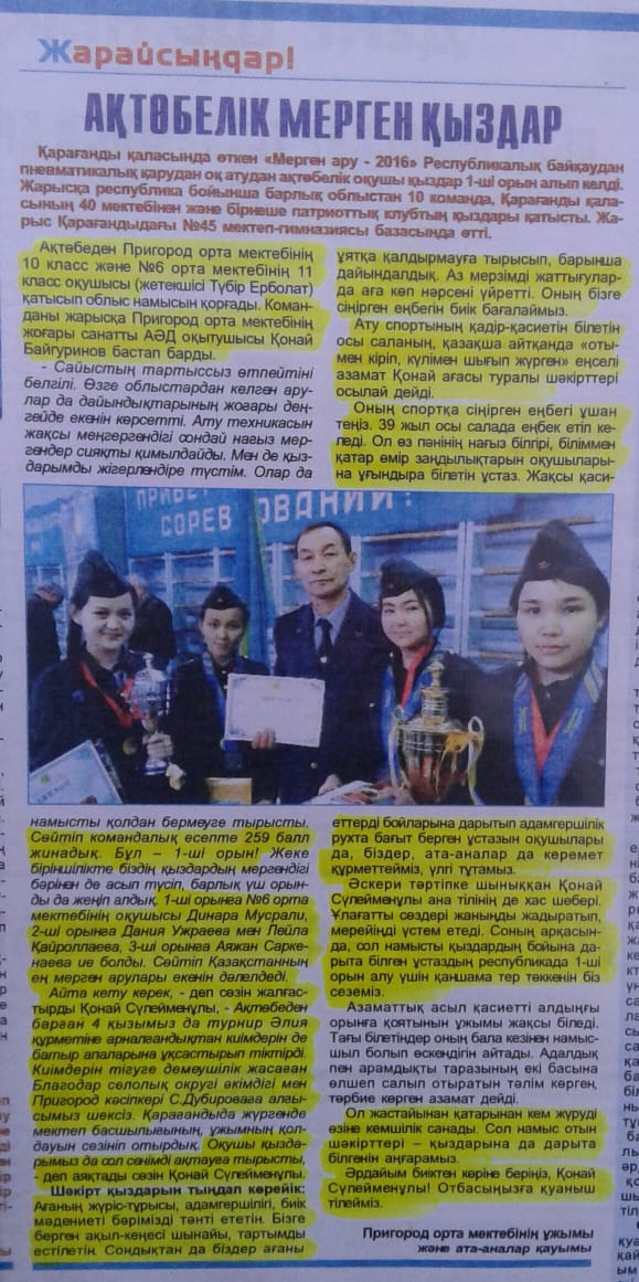 - Ақтөбе қаласының педагогтары арасында өткен пневматикалық винтовкадан ату бойынша 1 орын, медаль;