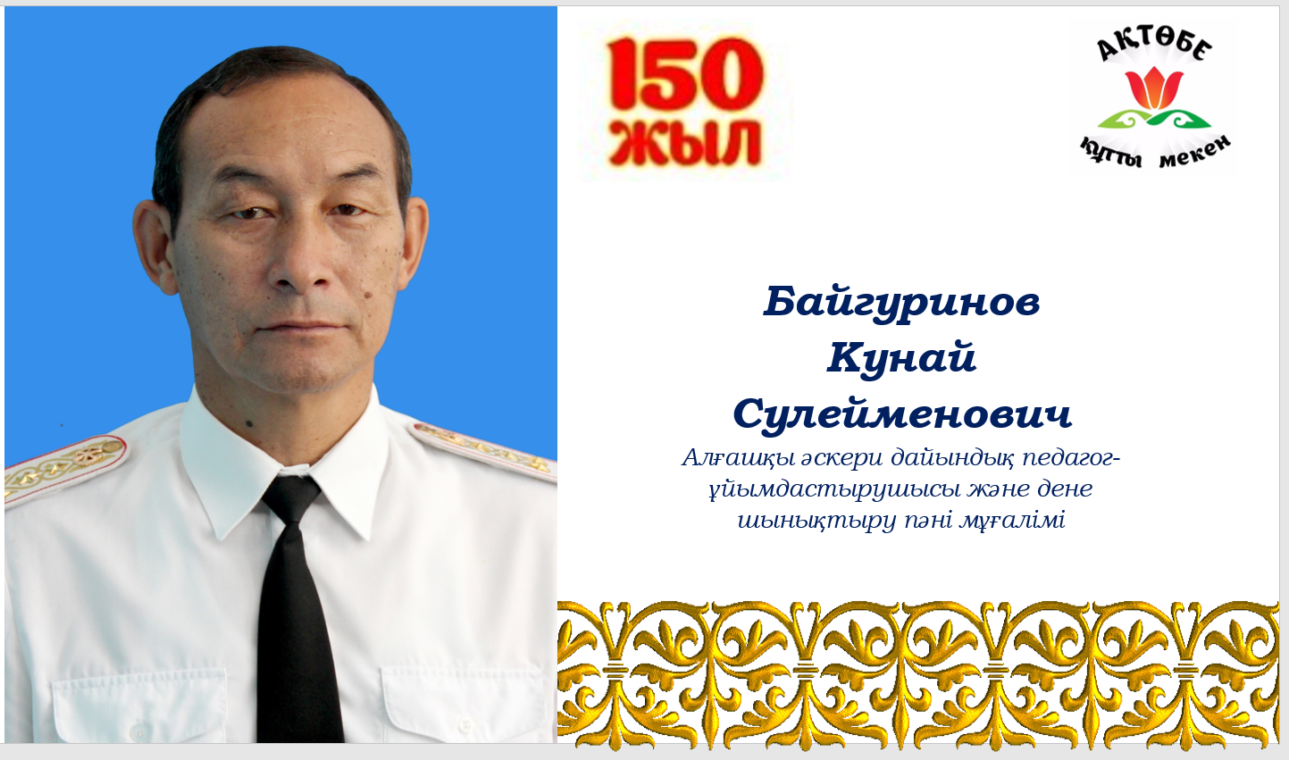 Байгуринов Кунай Сүлейменұлы -ардагер ұстаз. Ақтөбе қаласы Пригород орта мектебінде үздіксіз 38 жыл бойы жас ұрпақтың бойына патриоттық тәрбие берумен қатар, болашақ ел қорғандарын дайындап келе жатқан алғашқы әскери дайындық жетекшісі, жоғары білімді, біліктілігі жоғары деңгейдің жоғары санатты мұғалімі, әскери шені –капитан. Бірнеше түлектері әскери салада қызмет етеді. Педагог пен оның оқушылары республикалық, облыстық және қалалық жарыстардың жеңімпазы.