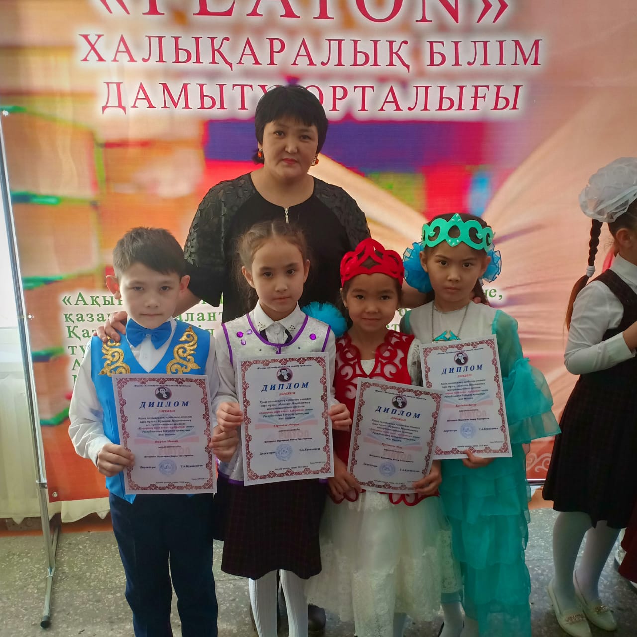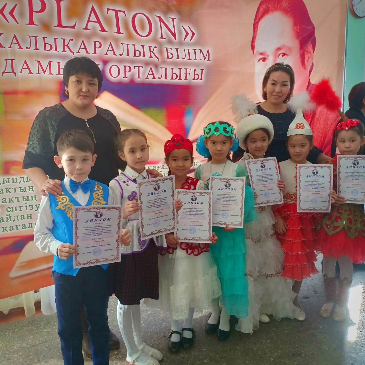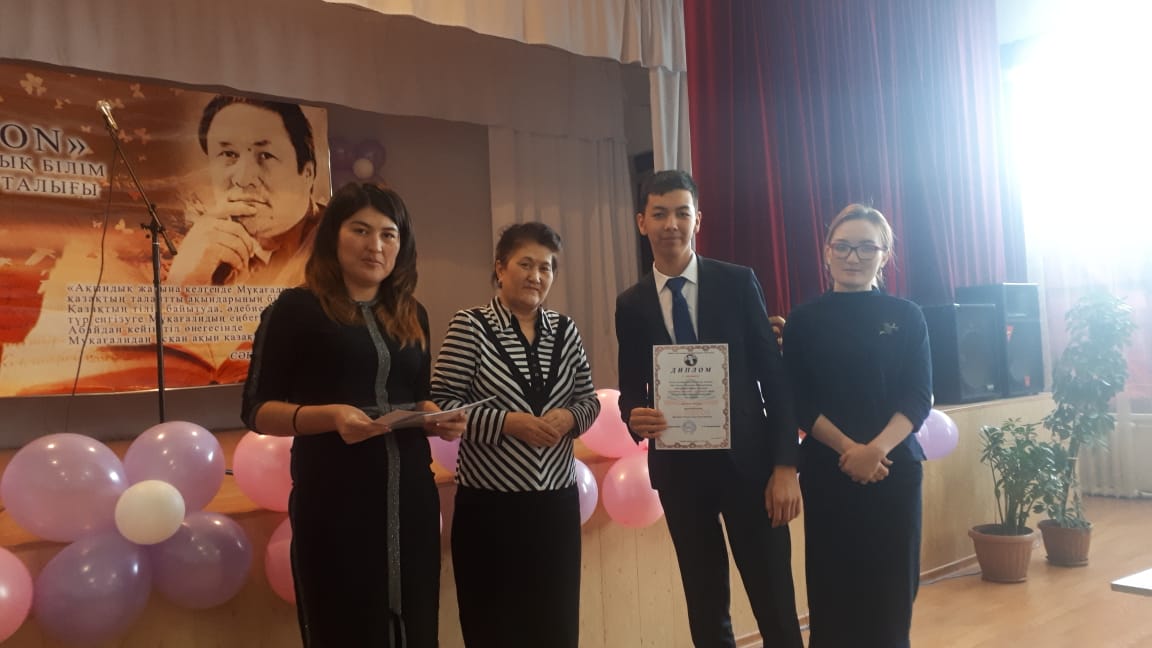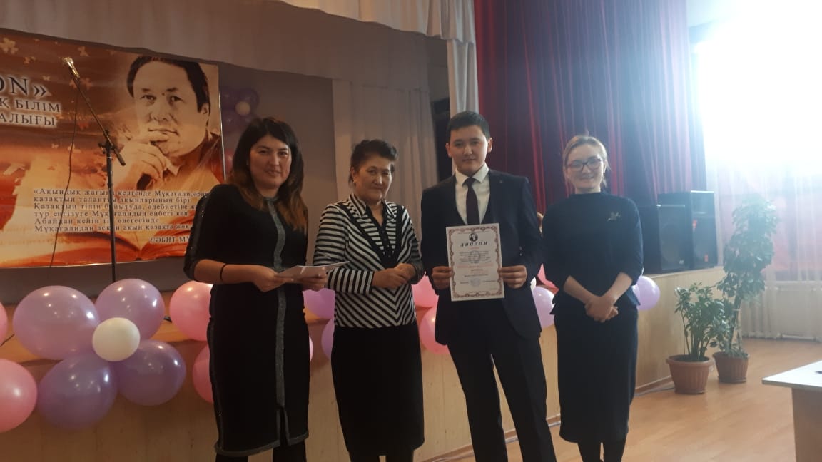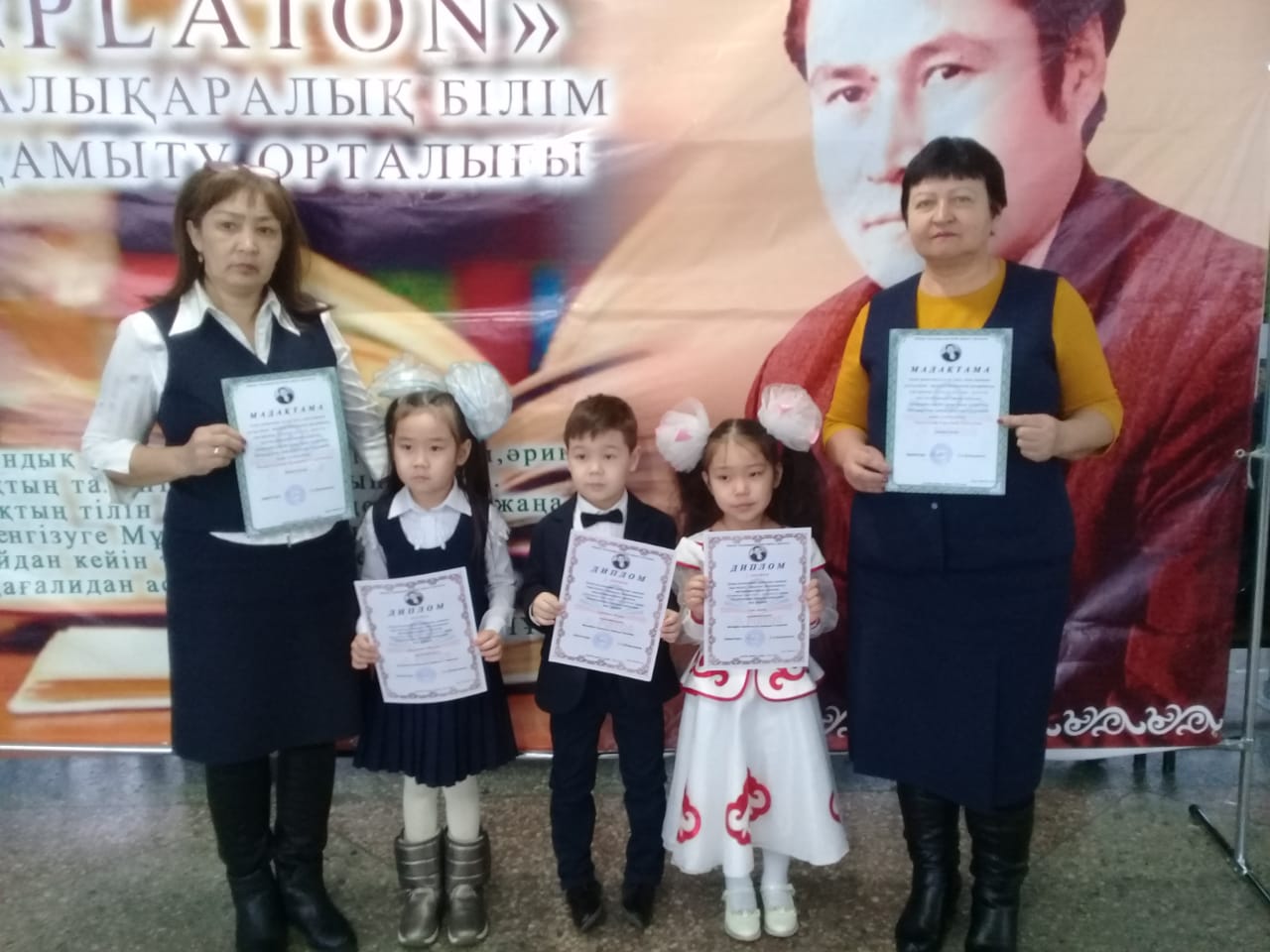 Мектепалды даярлық тобының тәрбиеленушілері Серікқали Ислам 2 орын, жетекшісі С.В.Уразгулова; Серік Айзере, Жамаладин Жансая 2 орын, жетекшісі К.У.Мамбеткулова; 2 «А» класс оқушылары Сарсенбай Назерке 1 орын, Куантаева Анар, Қалдыбай Кәусар,Өмірбек Мақсат 2-орын жетекшісі Ж.Т.Жұрманова; 3 «А» класс оқушылары Жайлыбай Жарқынай, Амирова Асия -1 орын Қалдыбай Қымбат -2орын жетекшісі О.Т.Кемалова; 9 «А» класс оқушылары Айтенов Саулет 2 орын, Таскенов Диас 3 орын жетекшісі: Г.Б.Жанина; Әділшанова Жансая 2 орын, жетекшісі: Г.Ж.Рахметова; 10 «А» класс оқушылары Байтөре Арайлым 1 орын, Таскенов Бекзат 3 орын жетекшісі: Б.С.Байдовлетова. Байқауға оқушыларын дайындаған жетекшілер мадақтамамен марапатталды. Қазақ тілі мен әдебиеті пәні мұғалімі, мектеп директоры Г.Б.Жанина «Үздік директор» төсбелгісімен, бастауыш класс мұғалімі Ж.Т.Жұрманова нәтижелі жұмыс көрсете білгені үшін «Үздік педагог» төсбелгісімен марапатталды.