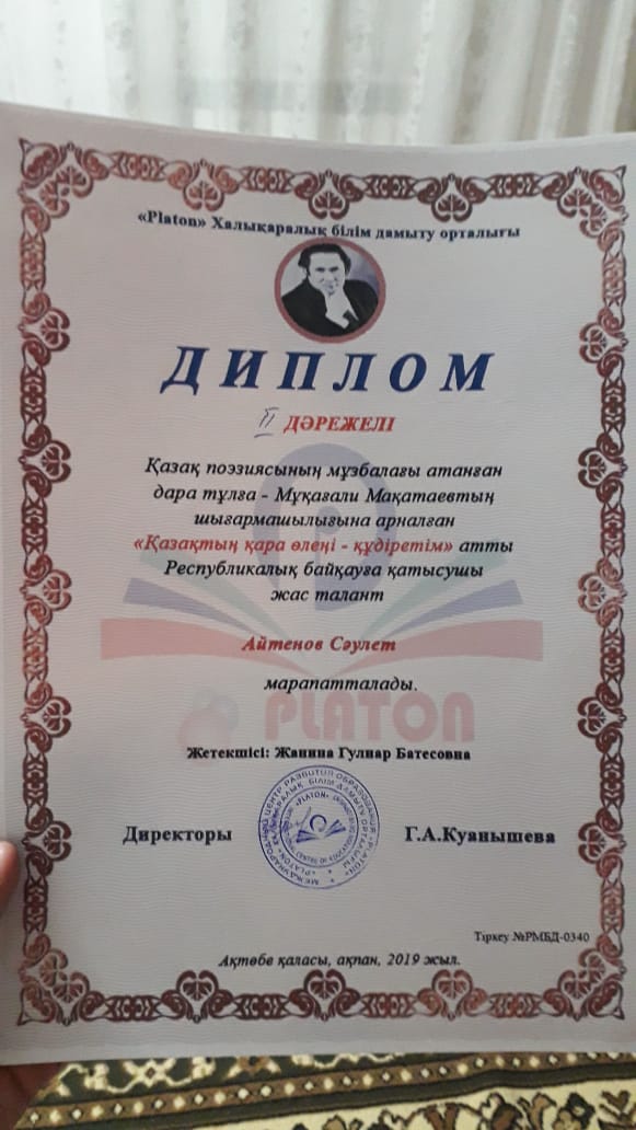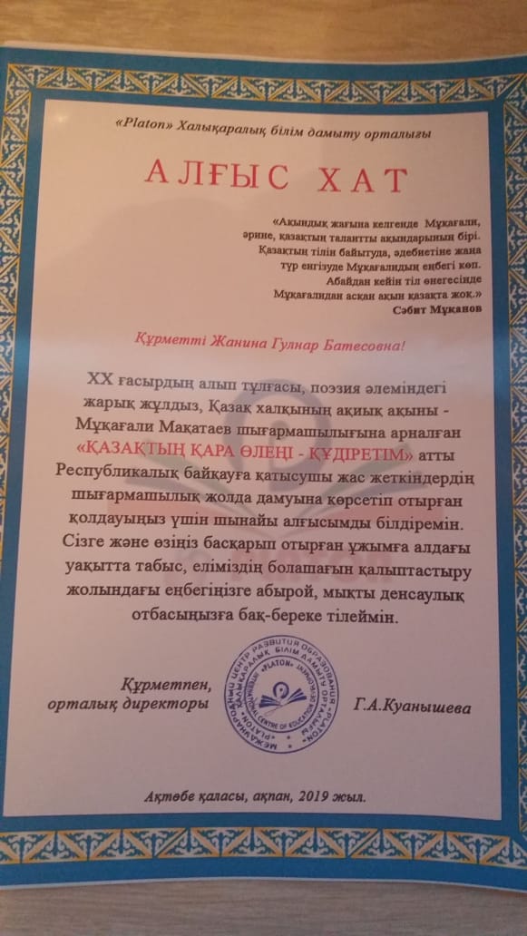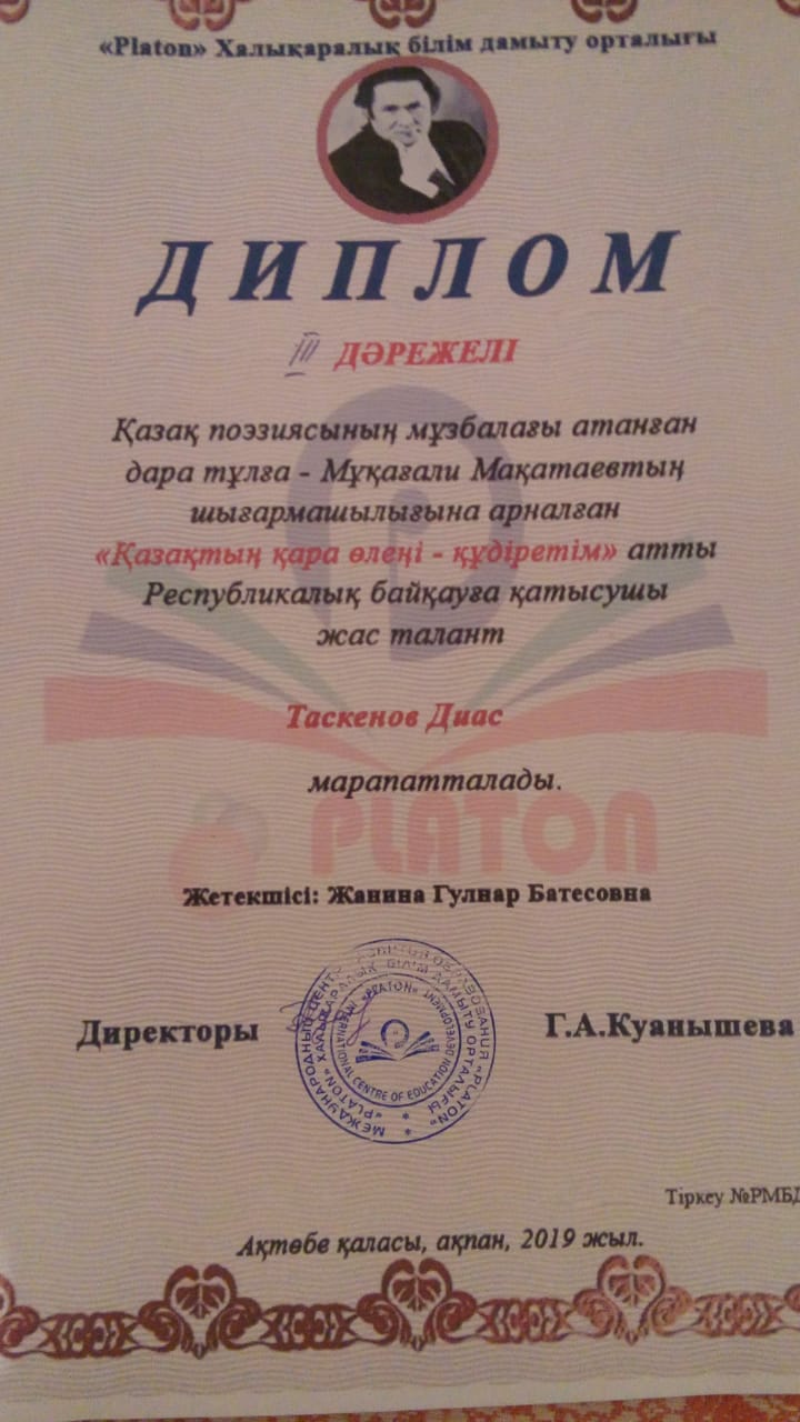 «Platon» халықаралық білім дамыту орталығы Мұқағали Мақатаевтың шығармашылығына арналған «Қазақтың қара өлеңі- құдіретім!» атты республикалық көркемсөз оқу байқауын өткізді. Пригород орта мектебінен байқауға 15 оқушы қатысып жүлделі орындарға ие болды.