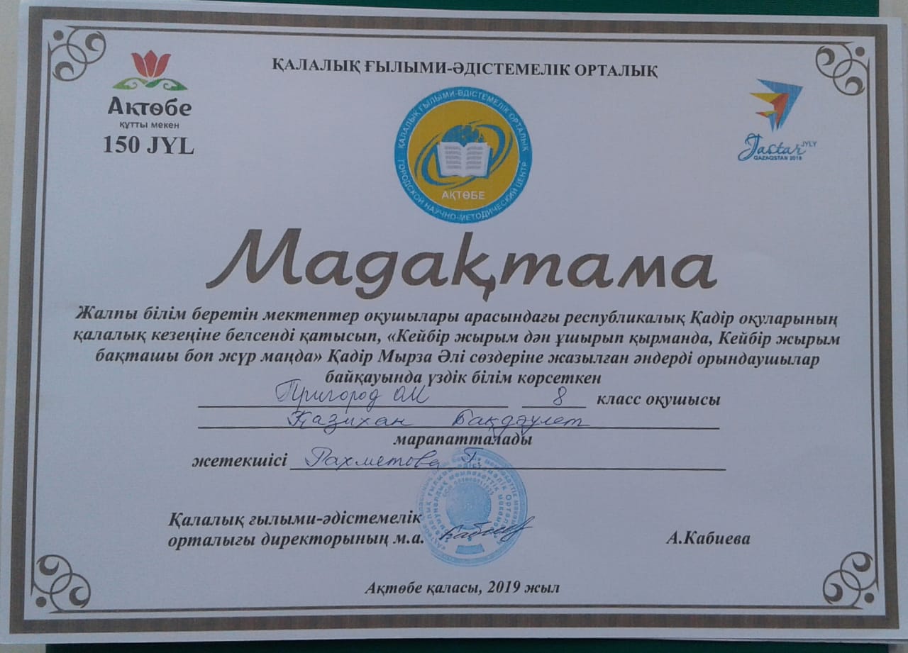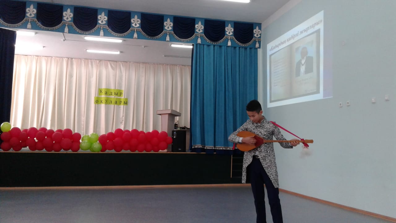 8 «А» класс оқушысы Қазихан Бәқдәулет "Кейбір жырым дән ұшырып қырманда, Кейбір жырым бақташы боп жүр маңда" - Қадыр ақынның сөзіне жазылған әндерді шырқау; бағыты бойынша қатысып, мадақтама иеленді. Жетекшісі Рахметова Г.Ж.