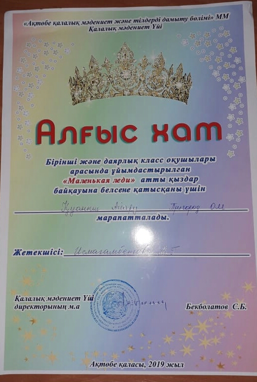 8-наурыз мерекесі қарсаңында "Геолог" мəдениет Үйінде бірінші және даярлық класс оқушылары арасында "Маленькая леди" атты қыздар байқауы өтті. Байқауға 1 «Ə» класс оқушысы Дайрабаева Перизат және 1 «Б» класс оқушысы Қуаныш Айару қатысып, өз өнерлерін көрсетті. Қуаныш Айару алғыс хатпен марапатталса, Дайрабаева Перизат жүлделі ІІІ орынға ие болды. Құттықтаймыз!