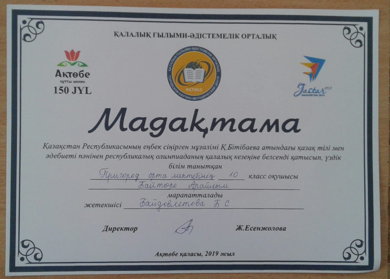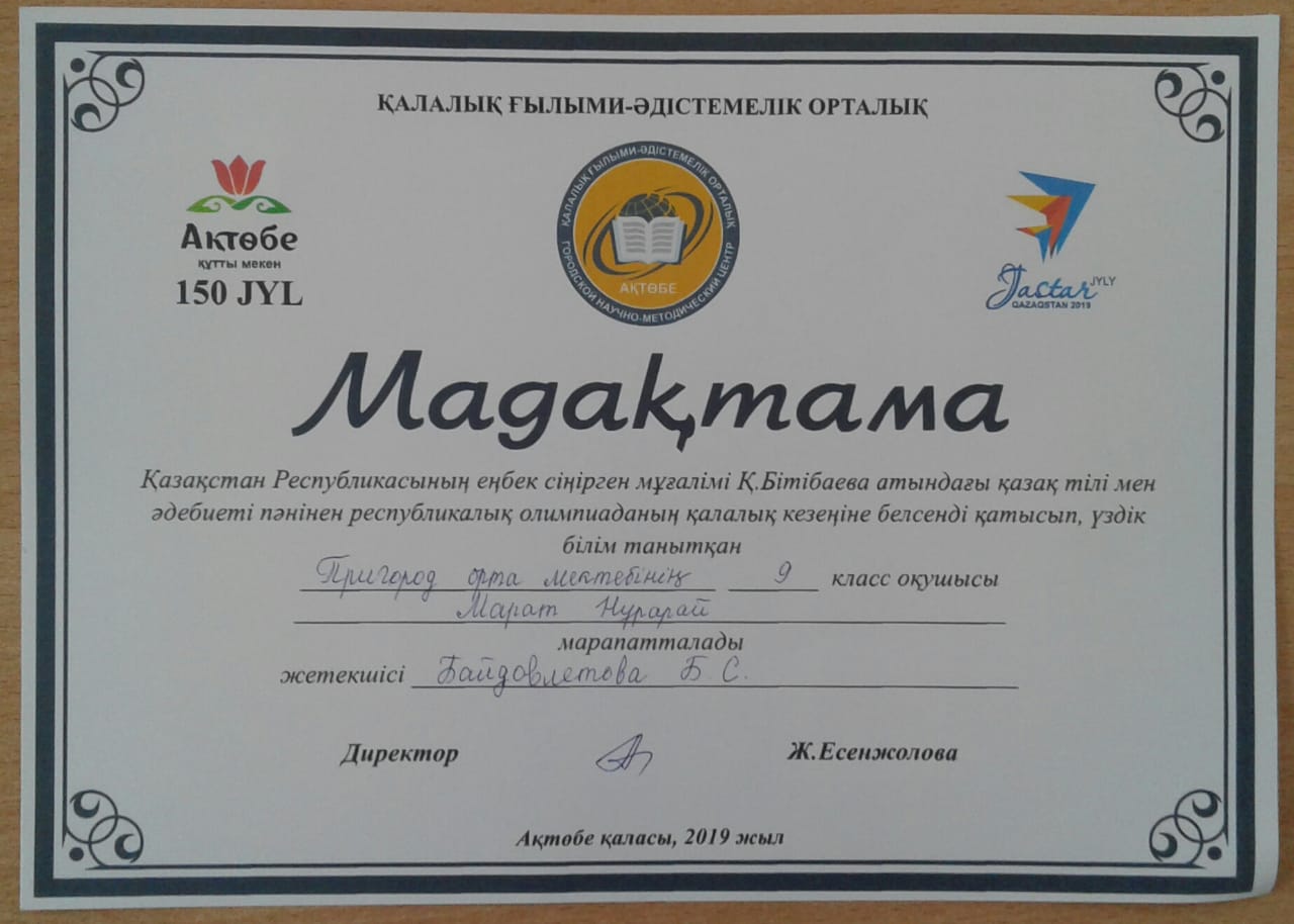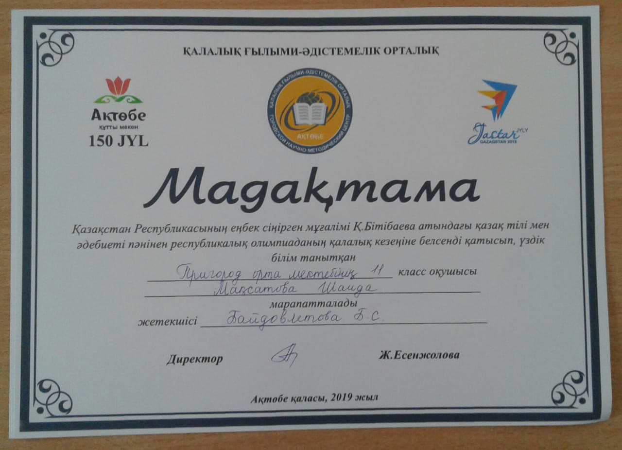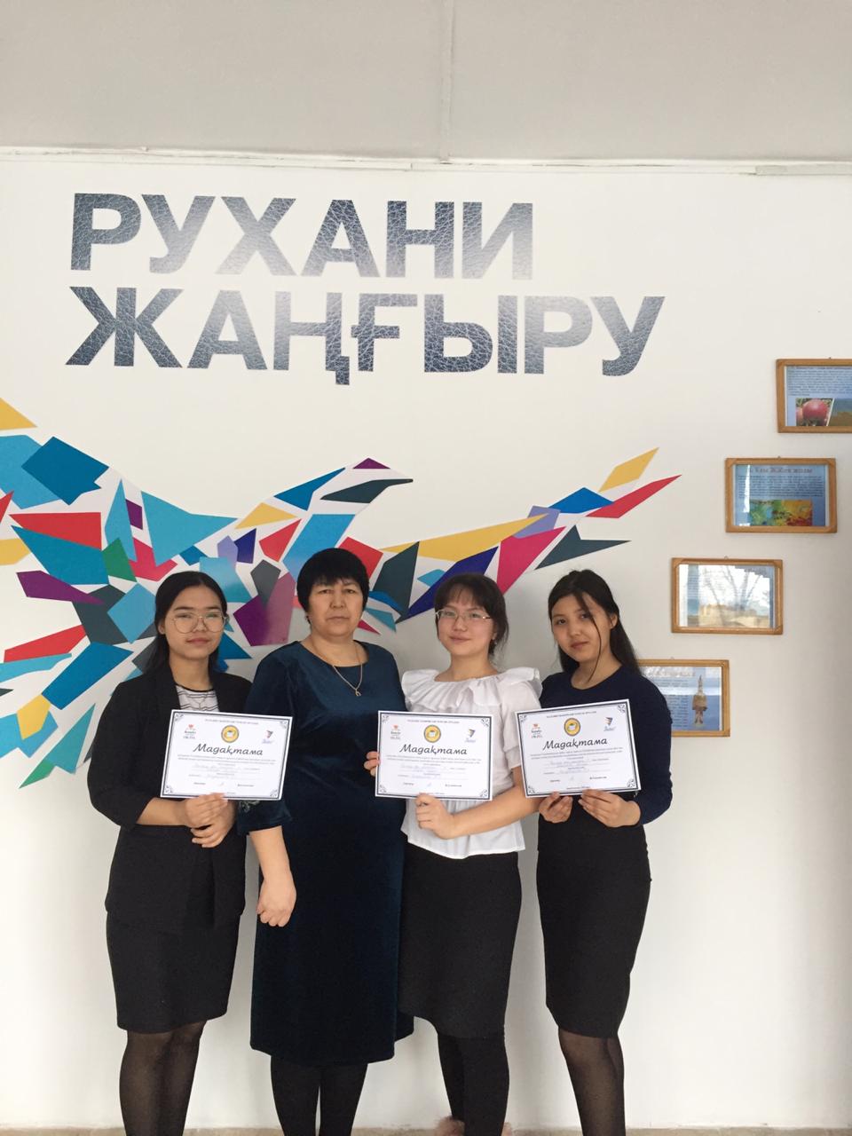 Олимпиадаға 9 «А» класс оқушысы Марат Нұрарай, 10 «А» класс оқушысы Байтөре Индира, 11 «А» класс оқушысы Мақсатова Шаида қатысып мадақтама иеленді. Жетекшісі Байдовлетова Б.С.