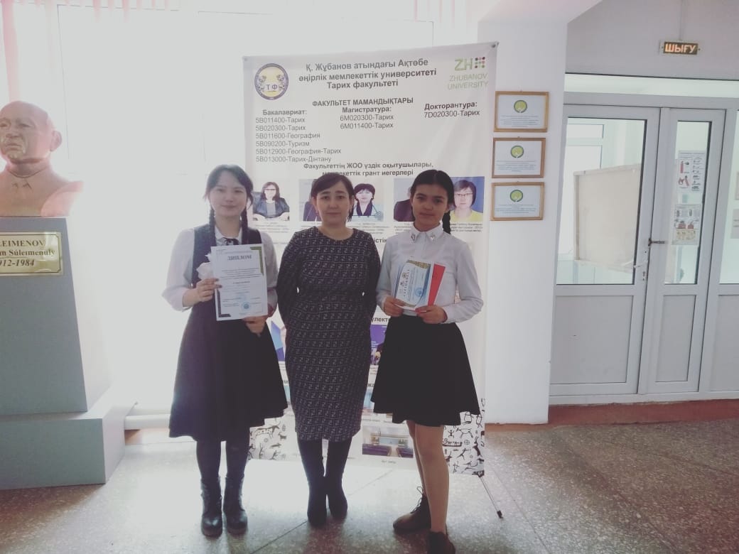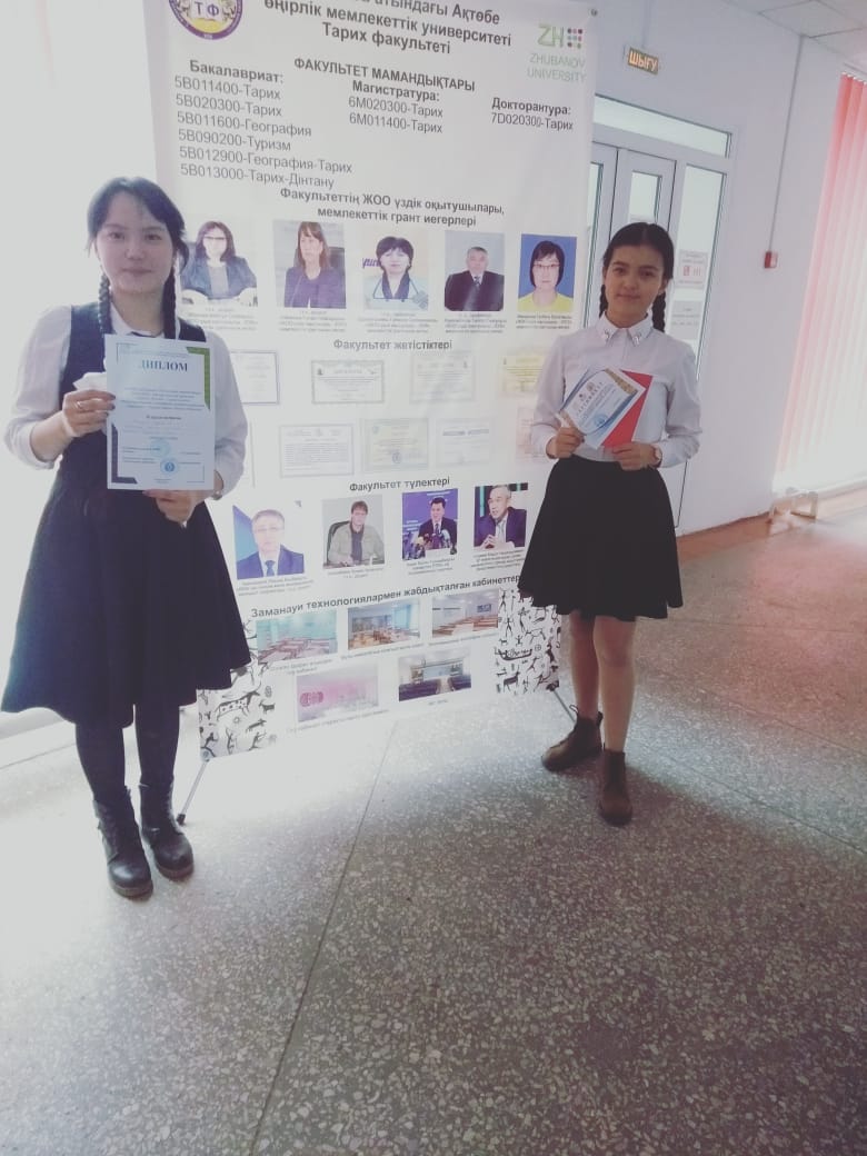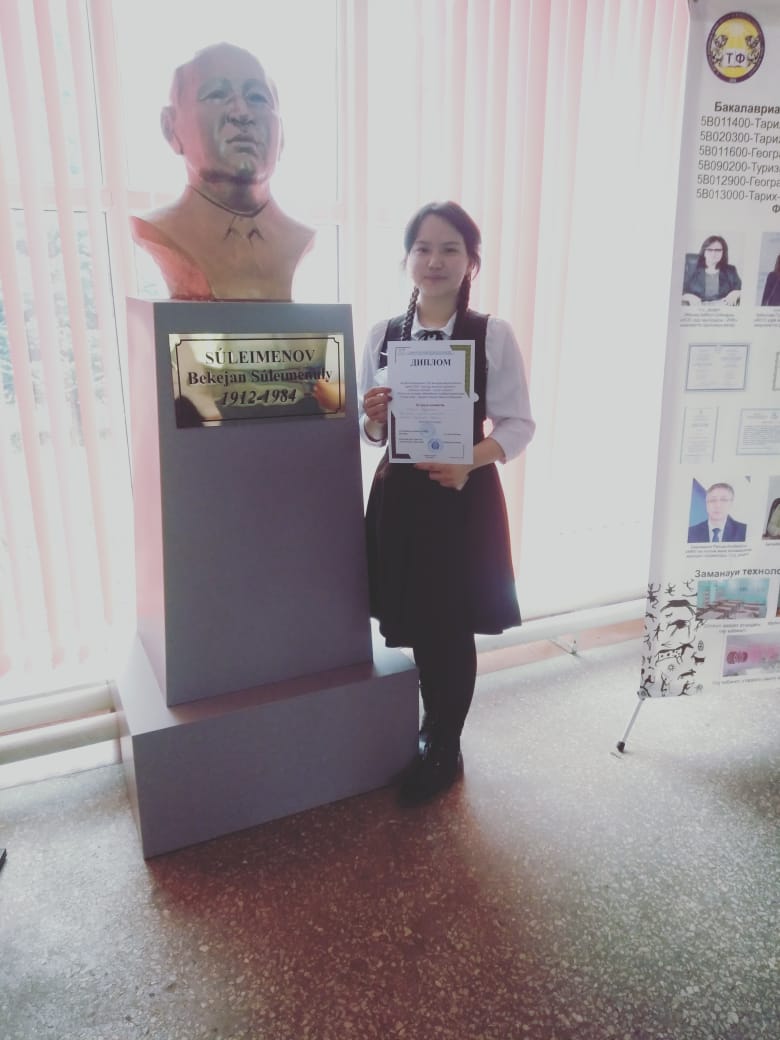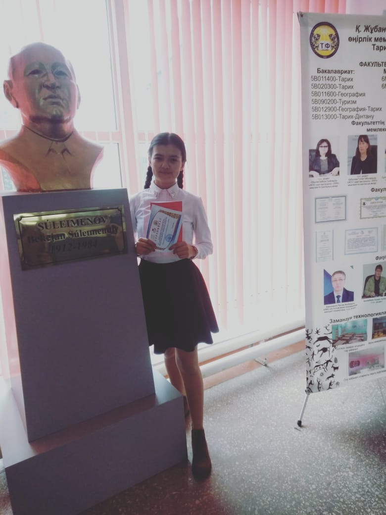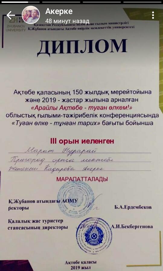 Мақсаты: оқушыларды патриоттыққа, Отанына деген сүйіспеншілікке тәрбиелеу, туған өлкесіне, тарихи мәдениетіне және рухани мұрасына деген көзқарасын арттыру, туристік-өлкетану белсенділіктерін арттыру, балаларды ғылыми зерттеу жұмыстары арқылы ізденімпаздыққа баулу. Конференцияға 9 «А» класс оқушылары Марат Нұрарай, Орынбасарова Эльвира «Туған өлке - тұнған тарих» бағыты бойынша қатысып, іздеу-зерттеу жұмысы жобасының презентациясын қорғады. Ғылыми-тəжірибелік конференцияның əділқазылар шешімі нəтижесінде Марат Нұрарай ІІІ орын, Орынбасарова Эльвира сертификат иеленді. Жетекшісі тарих пәнінің мұғалімі А.Е.Кадырова. Оқушыларымызды алған жүлделерімен құттықтаймыз!