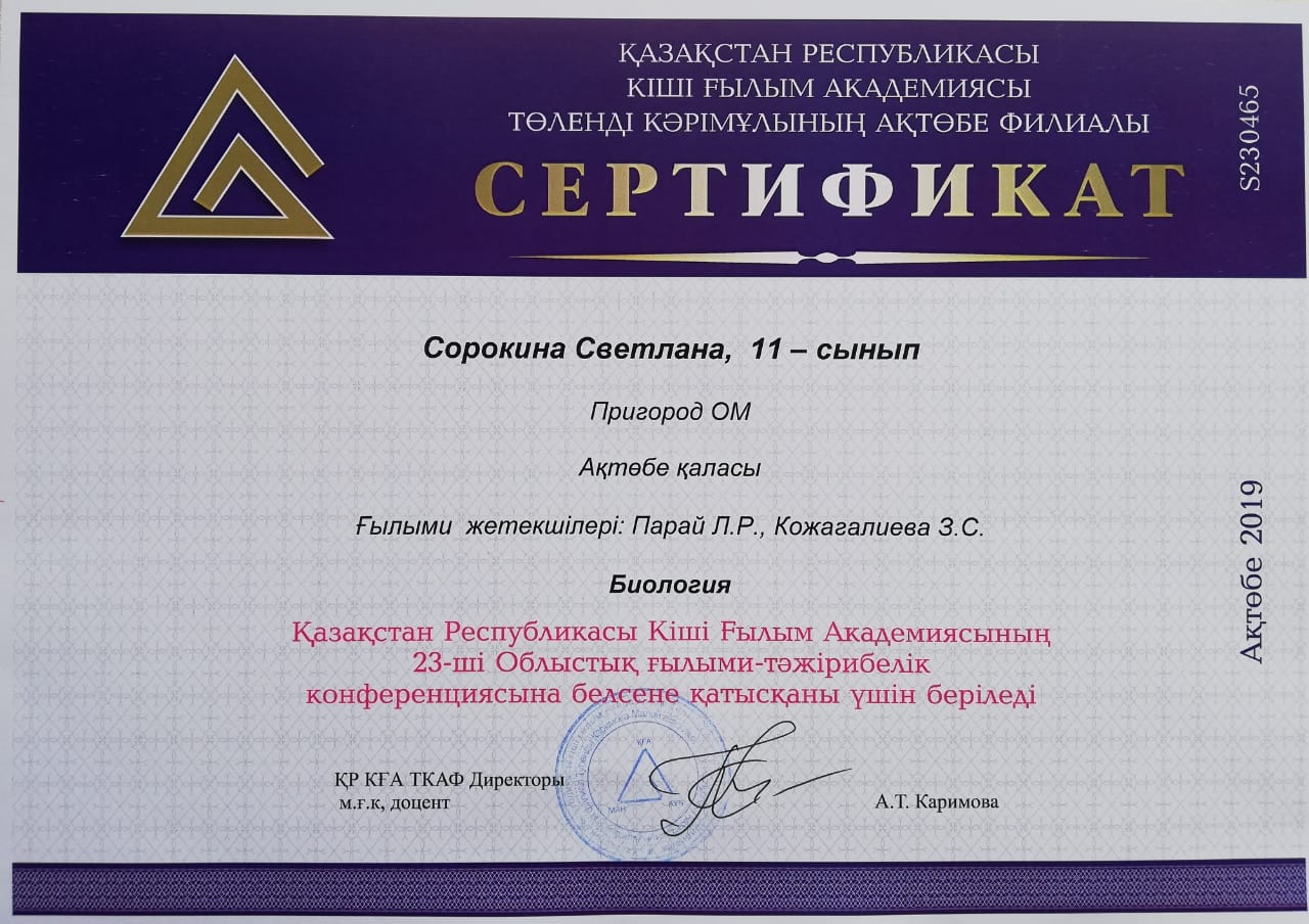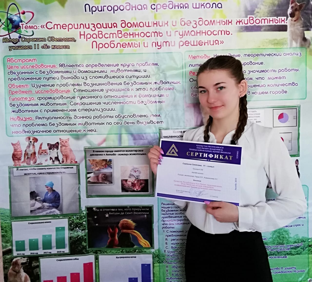 Соның ішінде тарих секциясы бойынша 7 «А» класс оқушылары Исаева А., Шонайбай Б. I орын (жетекшілері Кадырова А.Е., Өтепова А.Б.); География - өлкетану секциясы бойынша 6 «А» класс оқушылары Абдисалимов А., Байтуре И. -III орын ( жетекшілері Кадырова А.Е., Сакауова Р.А., ); қазақ тілі секциясы бойынша Шадиярова А., Сқақова К. грамота (жетекшілері Өтепова А.Б., Байдовлетова Б.С.;) 7 «А» класс оқушысы Алмураткызы Д.- сертификат, (жетекшісі Иса Г.Б.) биология пәні бойынша 11 «Б» класс оқушысы Сорокина С. сертификат иеленді. (жетекшісі Парай Л.Р.)