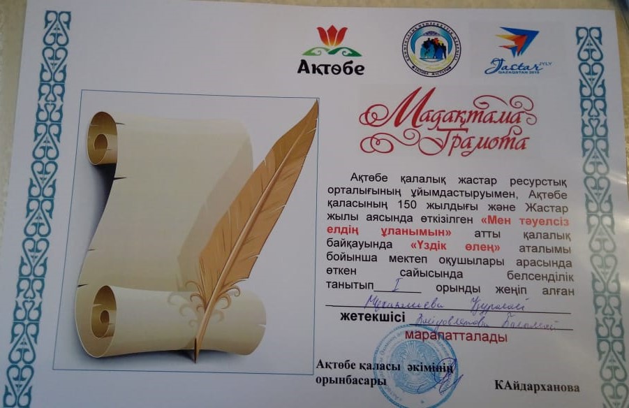 Ақтөбе қалалық жастар ресурстық орталығы Ақтөбе қаласының 150 жылдығы және Жастар жылы аясында «Мен Тәуелсіз елдің ұланымын» атты қалалық байқауын өткізді.