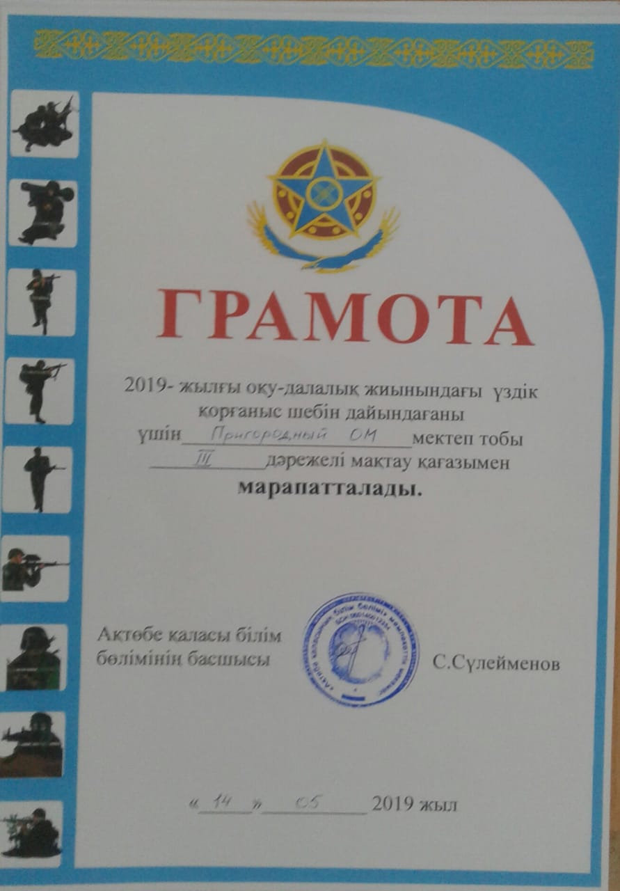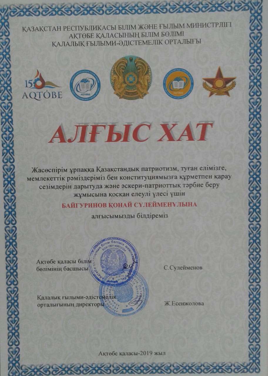 - Әскери –патриоттық тәрбие беру жұмысына қосқан елеулі үлесі үшін АӘД пәнінің мұғалімі Байгуринов Қонай Сүлейменұлы Алғыс хат иеленді.