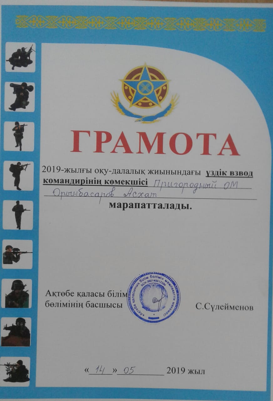 - Үздік взвод командирінің көмекшісі Орынбасаров Асхат грамота;