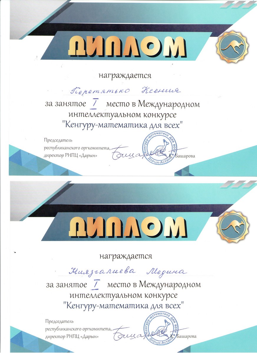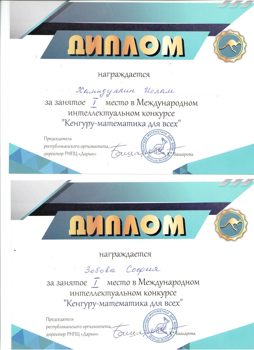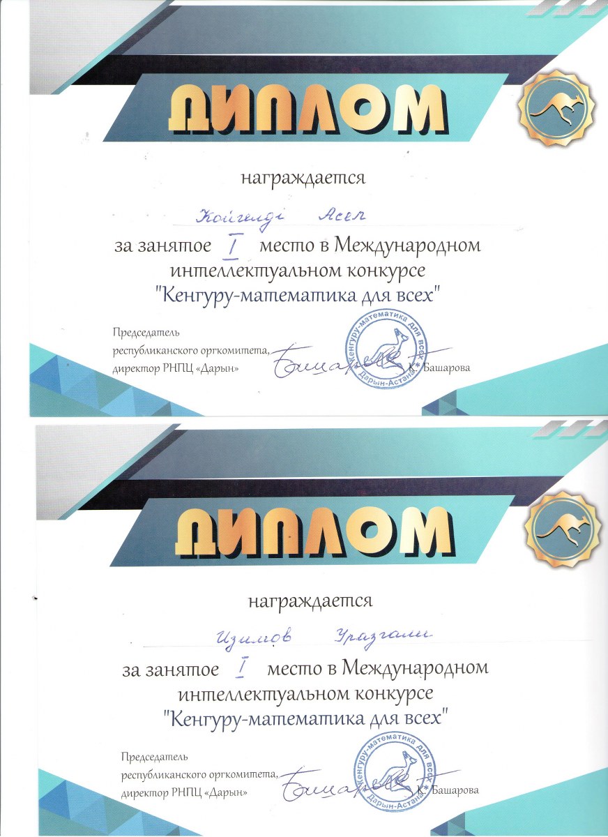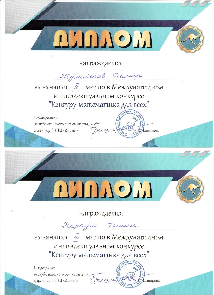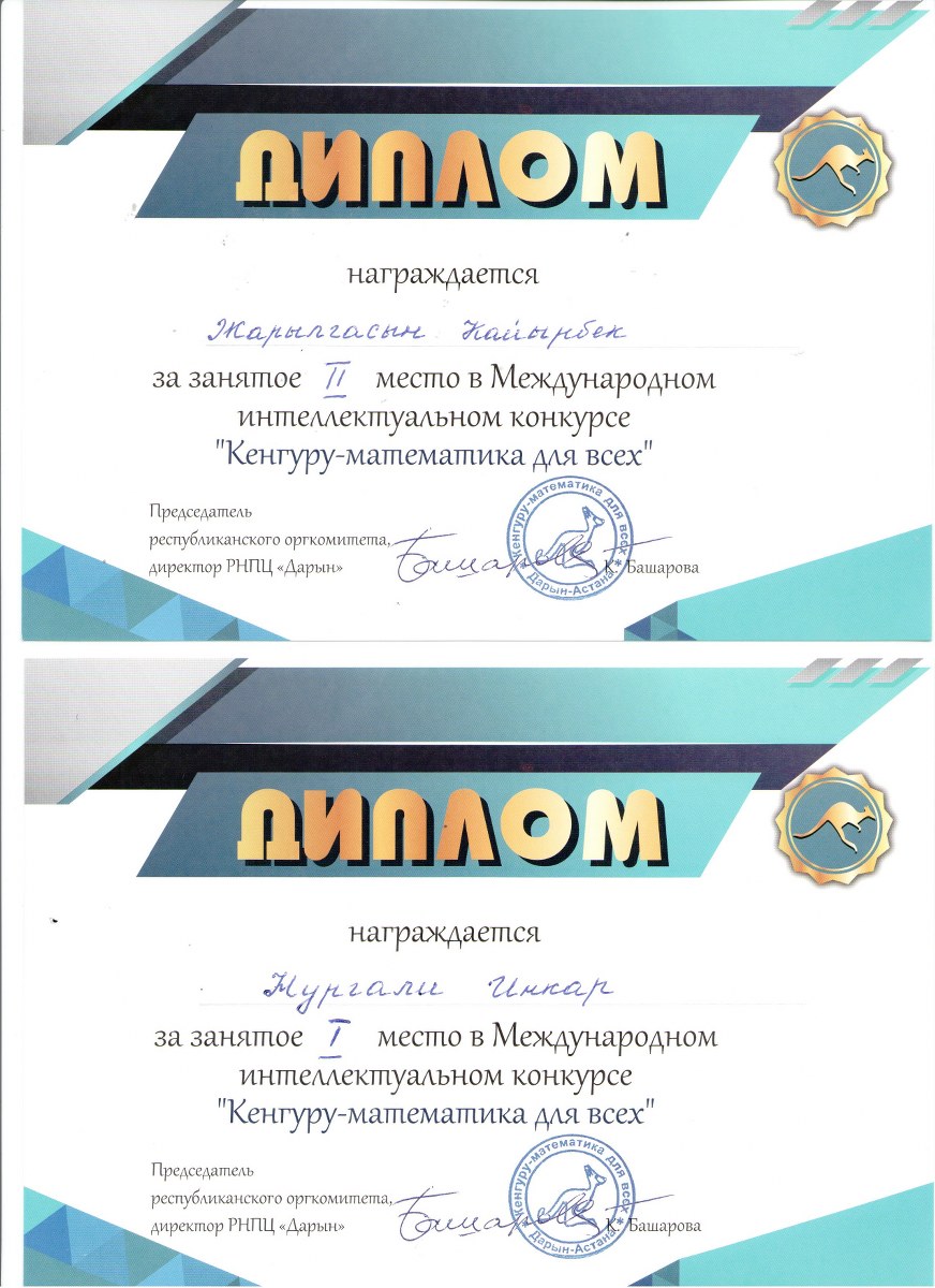 «Кенгуру – математика баршаға» республикалық интеллектуалдық конкурсына мектебімізден 20 оқушы қатысып, сертификат иеленді. 10 оқушы жүлделі орынға ие болды.