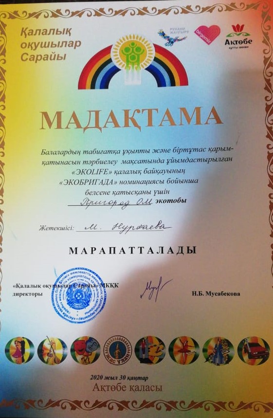 Байқауға мектебіміздің 6 «А» класс оқушылары қатысып, «ЭКОБРИГАДА» номинациясы бойынша мадақтама иеленді. Жетекшісі биология пәнінің мұғалімі М.К.Нурбаева. Құттықтаймыз!