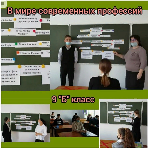 9 "Б" сынып оқушылары үшін болашақ мамандықты таңдауға көмек көрсету мақсатында "Қазіргі заманғы мамандықтар әлемінде" тақырыбында кәсіптік бағдарлау сағатын өткізілді. Директордың тәрбие жұмысы жөніндегі орынбасары Т.И. Фалалеева 9 сынып оқушыларын еңбек нарығындағы заманауи қажеттіліктермен, жаңа өзекті мамандықтармен және болашақта қажет мамандардың болжамдарымен таныстырды.