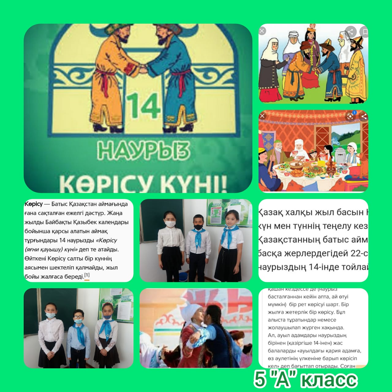14 Наурыз-Жаңа жылдың басы болып саналады.Еліміздің батыс аймақтарында, Маңғыстау, Атырау облыстарында тегіс, Орал, Ақтөбе облыстарының кей бөлігінде, көршілес Ресейдің Астрахан, Саратов, Орынбор, Қарақалпақстанның қазақтар көп қоныстанған жерлерінде Наурыз айы туды деп, наурыз айының 14-күнінен бастап, «Көрісу» салты басталады. Кей жерлерде «амал» деп те атайды.. Әр үй жеті шелпегін пісіріп, дастарханын жайып қояды. Наурыздық жасап, ата-баба рухына дұға бағыштайды.Біздің жақта осы күні кішілер үлкендерге, көрші-қолаң, ағайын-туыс бір-біріне, ал, бала-шағалар әр үйге кіріп, көрісіп құттықтап шығады. Тек келіндер аталарына және қайынағаларына көрісуге болмайды. Ер адамдар құшақтасып, төс түйістіреді, әйелдер жағы да құшақтасып, беттерінен сүйіп, көрісіп жатады. Ескі қазақша, ескі түрікше жаңа жыл күнінің аты – ұлыс. Жаңа жыл басының ұлыс екеніне мынадай дәлел бар. «Ұлыс күні қазан толса, ол жылы ақ мол болар. Ұлы кісіден бата алса, сонда олжалы жол болар» – деген. Сонда көрісу дәстүрі тек батыста емес, барлық жерлерде де болған, тек бертін келе халық ұмытып кеткен, отаршыл саясат ұмыттыруға тырысқан. Бірақ, осы батыс аймақтарда ұмытылып көрген емес. ХХ ғасырда ел шұбырған аумалы-төкпелі заманда сан қазына түбірімен құрып, ұмытылып кеткені шындық. Ай мен Үркердің қиылысып өтуін көшпелі жұрт тоғыс атаған ғой. Наурыз айында тоғыстың келетін тұсы да осы күндерге келетін болса керек. Халық сенімінде 14-нен 15-на қараған күні қой құмалағы қарға батып кетсе, жақсылыққа санап, ырым еткен. 15-і күні халық қыс жұлдызы бітіп, жаз жұлдызы туды деп есептеген екен. Сонымен, 14 НАУРЫЗ – қазіргі күнтізбе бойынша Наурыз айы туады. Келе жатқан Жаңа жылымыз – Наурыз құтты болсын!