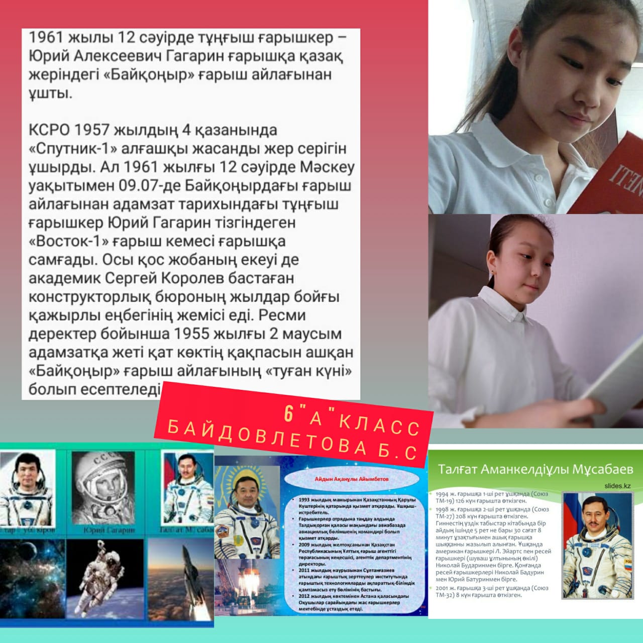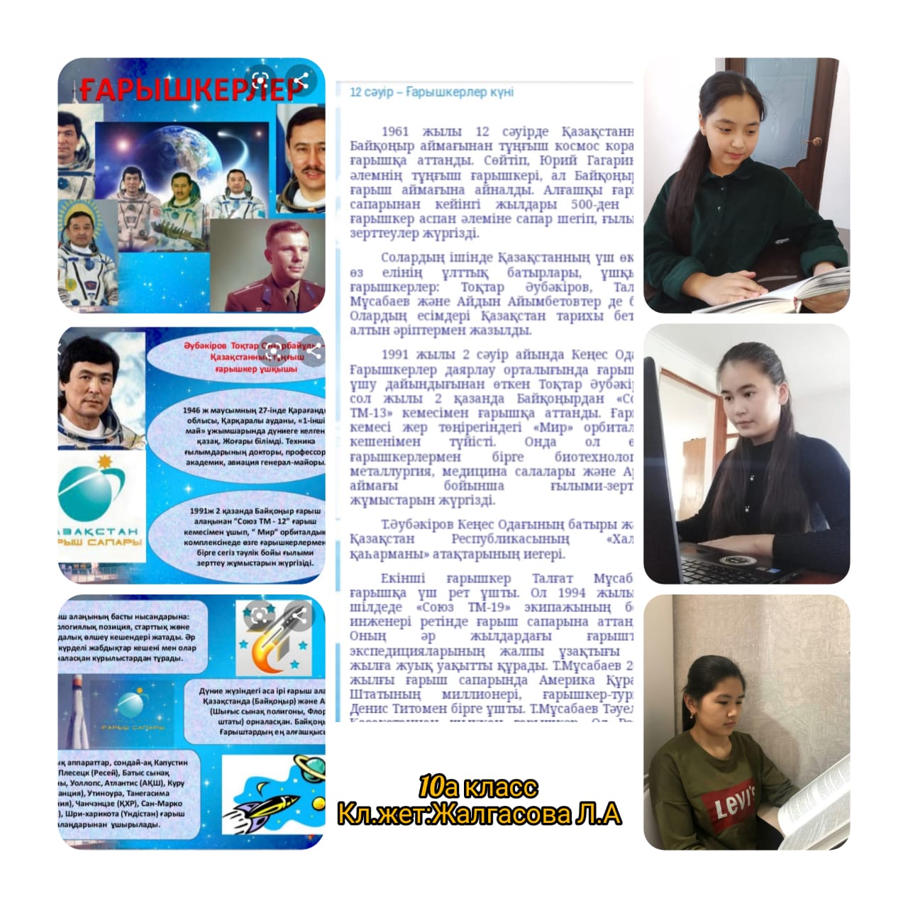 Пригород орта мектебінде 1-11 класс аралығында 12 сәуір -Ғарышкерлер күніне арналған онлайн класс сағаты ұйымдастырылды.