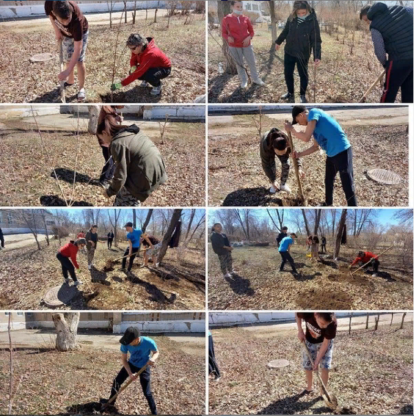 Пригородный орта мектебінің 9"Б" сынып оқушылары 11 «Б» сынып оқушыларынан «Мектебіміздің аумағын көгалдандыру» эстафетасын қабылдады. Сынып жетекшісі Н. П.Карповамен бірге балалар мектеп жанындағы учаскеге шие көшеттерін отырғызды.