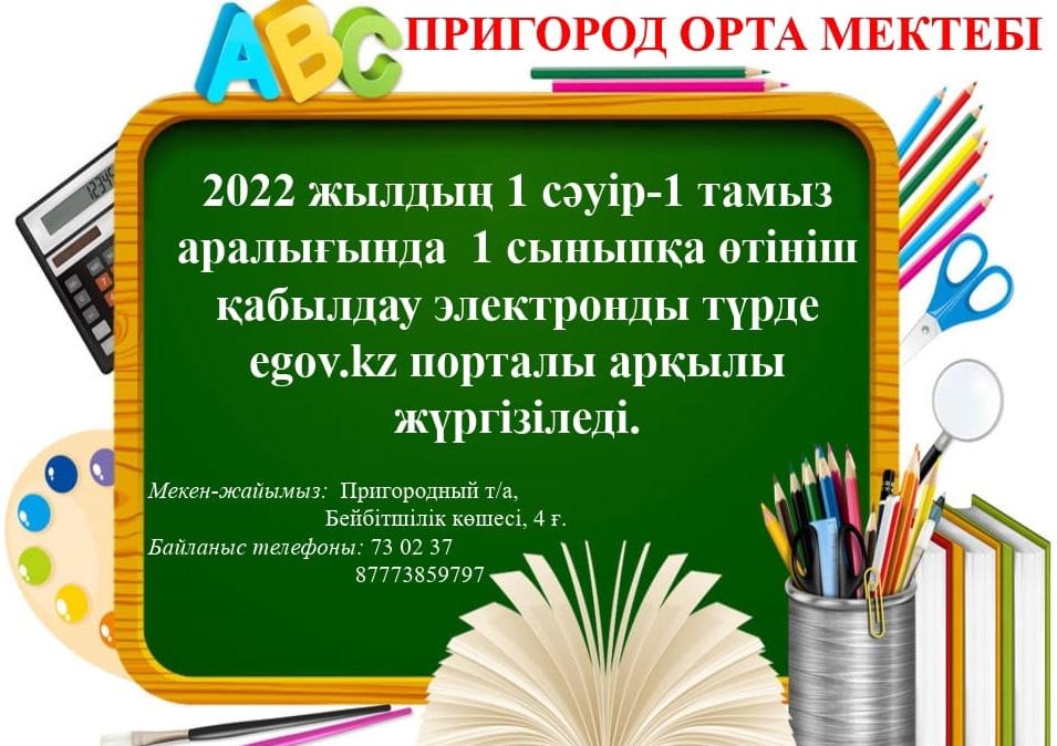 «Пригород орта мектебі» КММ-не 1 сәуірден бастап жаңа 2022-2023 оқу жылына 1 сыныпқа оқушыларды қабылдау басталатынын хабарлайды.