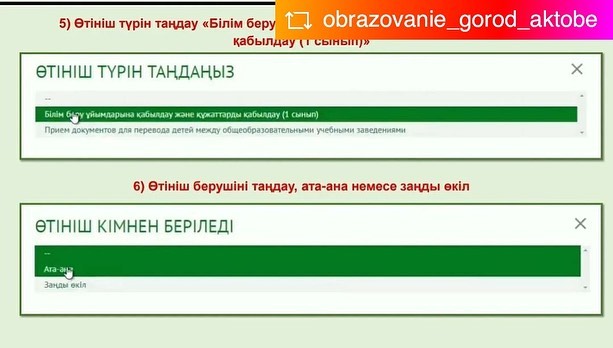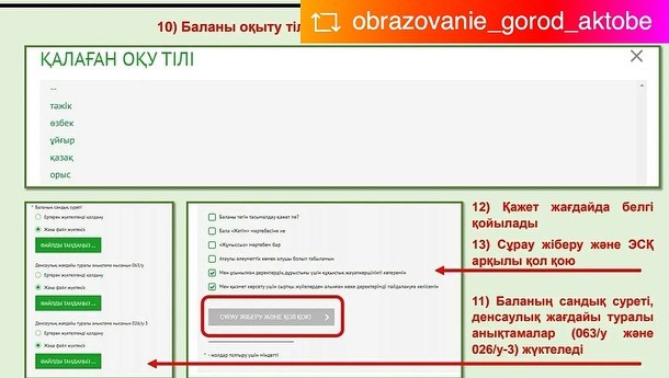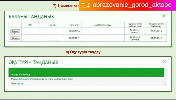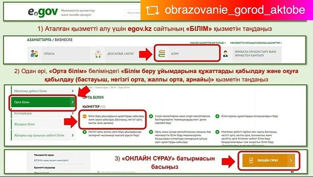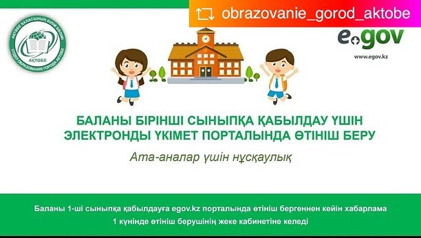 ?Білім беру ұйымдары дайындық деңгейіне қарамастан, алты жастағы және күнтізбелік жылда алты жасқа толатын балаларды бірінші сыныпқа қабылдауды қамтамасыз етеді. Құжаттарды қабылдау және мемлекеттік қызметті көрсетудің нәтижелерін беру "электрондық үкімет" веб – порталы арқылы жүзеге асырылады.
