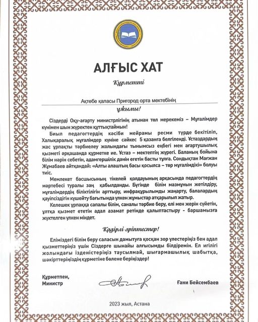 5 қазан Халықаралық мұғалімдер күніне орай мектеп ұжымы ҚР Оқу-ағарту министрлігінің атынан алғыс хатымен марапатталды