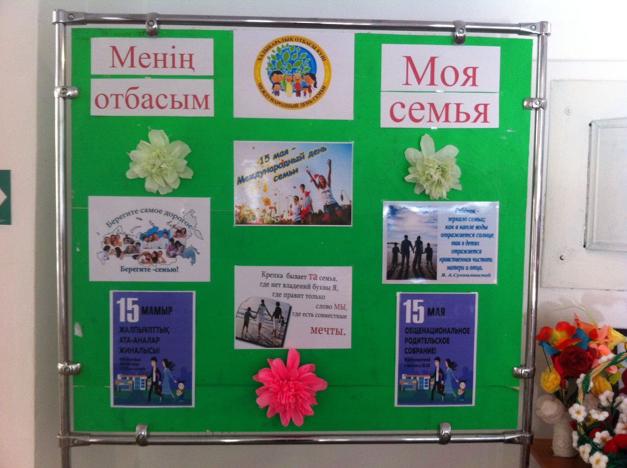 В рамках празднования Дня Семьи в Пригородной средней школе проведено Общенациональное родительское собрание "Образованная нация- качество обучения и семейные ценности" на котором присутствовал общественный деятель Фалалеев Ю.Н, специалист Благодарного СО Алекенова Р.А, члены Попечительского Совета школы и родительская общественность. В празднично оформленном фойе была организована выставка совместных работ учащихся и их родителей. На собрании говорили о реализации Программы "Рухани жангыру", успехах года, о работе Попечительского Совета и многом другом.