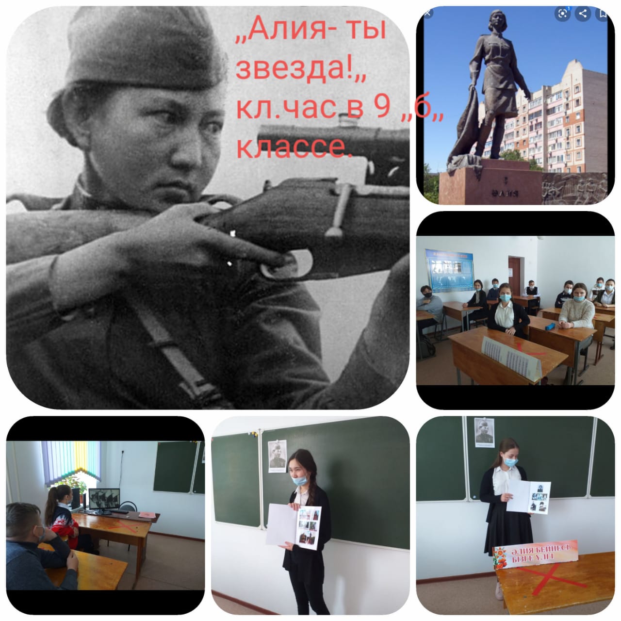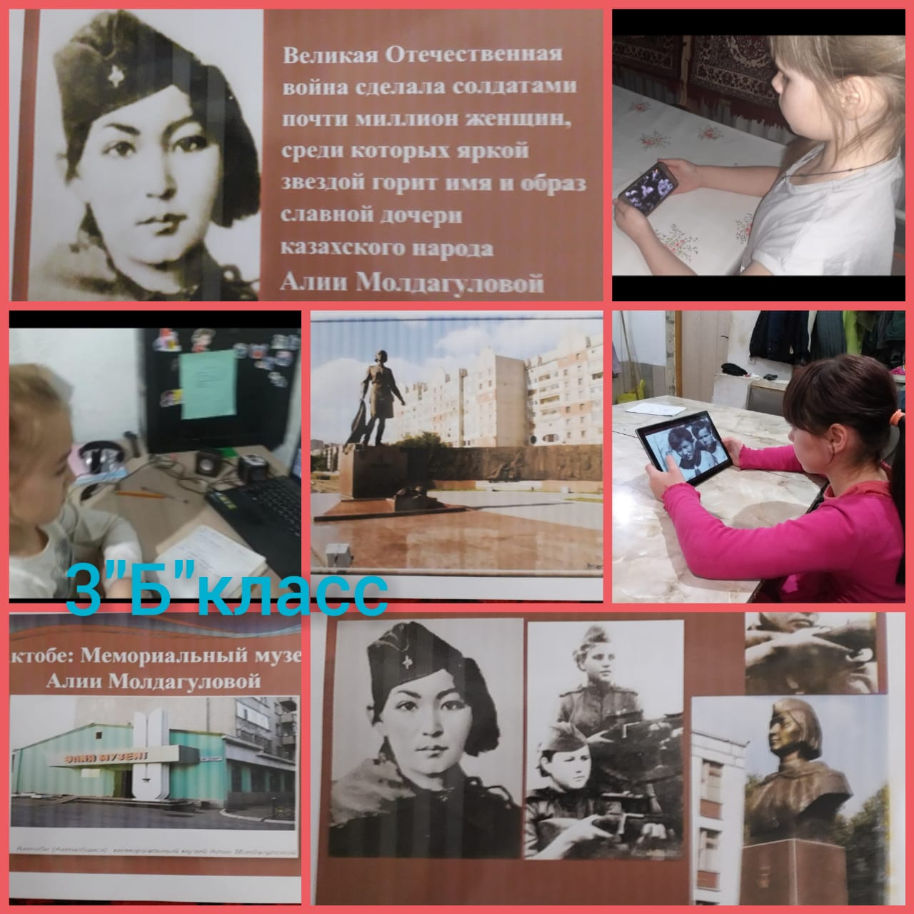В Пригородной средней школе в память об Алие Молдагуловой ежегодно в январе проводятся мероприятия. На прошлой неделе были проведены онлайн классные часы, посвященные жизни и подвигу нашей славной землячки. На онлайн классных часах были организованы просмотр и обсуждение фильмов, прочитаны отрывки из литературных произведений об Алие Молдагуловой.