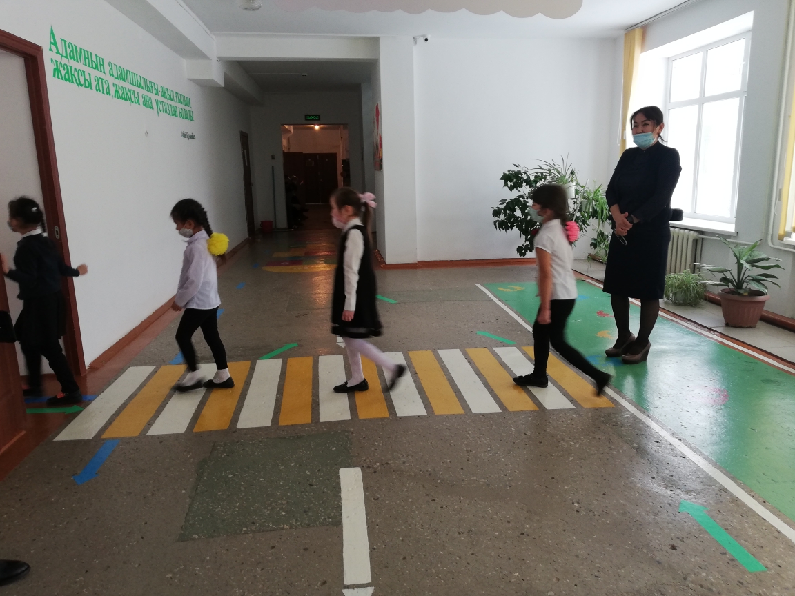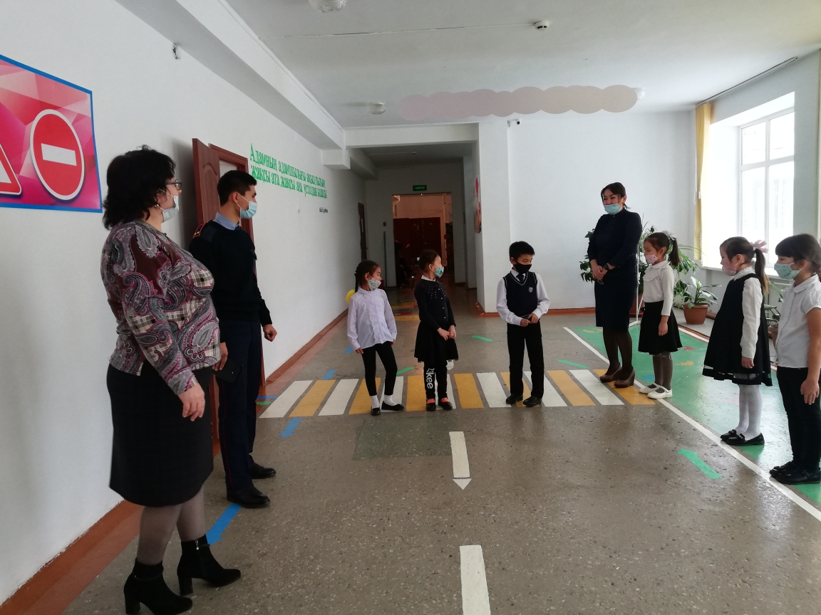 В Пригородной средней школе для учеников начальных классов на больших переменах проводится "Минутка знаний правил дорожного движения". Инспектор по делам несовершеннолетних лейтенант полиции Толеугалиев М. А. в игровой форме знакомит учеников с правилами безопасного поведения на улице, учит различать дорожные знаки.