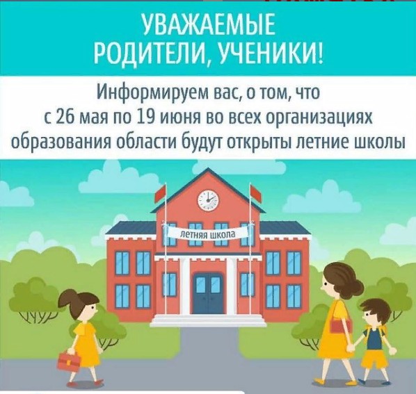 Информируем вас, о том, что с 26 мая по 19 июня во всех организациях образования области будут открыты летние школы с целью восполнения пробелов в знаниях учащихся, качественного усвоения пройденного материала по предметам.