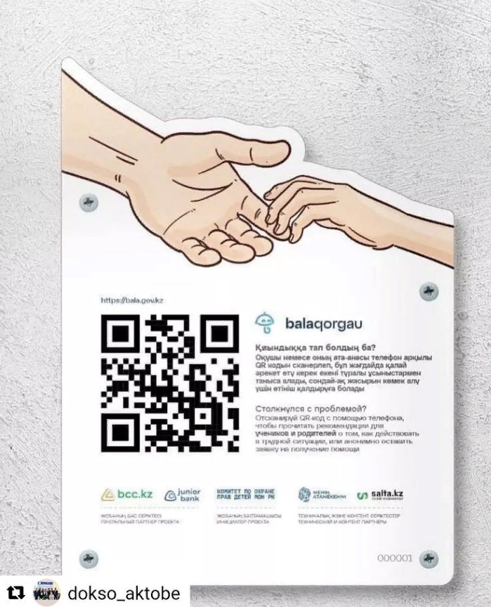 Дети и их родители могут перейти на сайт «Balaqorgau», отсканировав QR-сайт с таблички, установленной в каждой школе. На сайте Вы можете ознакомиться с советами по разрешению проблемных ситуаций.