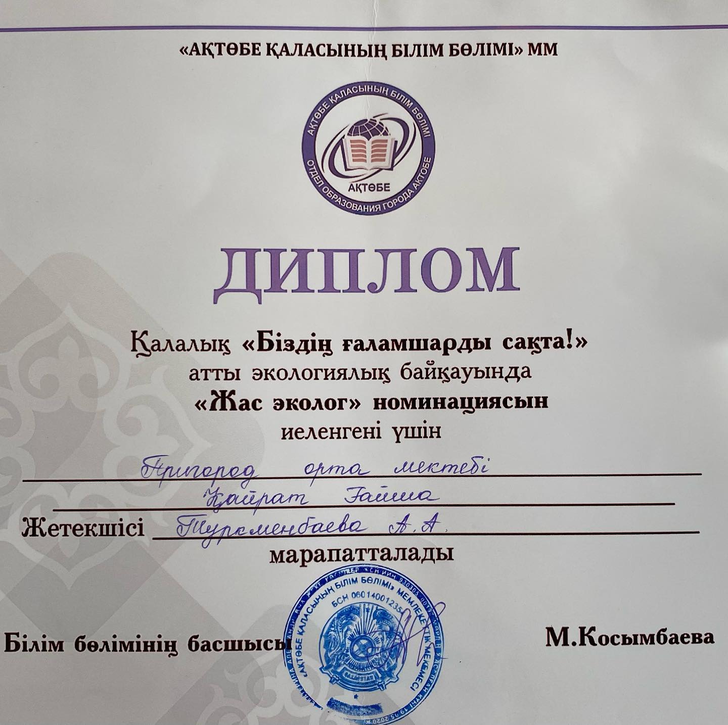 В городском экологическом конкурсе «Спаси нашу планету"! ученица 5 «А» класса Кайрат Гайша получила номинацию "Жас эколог".