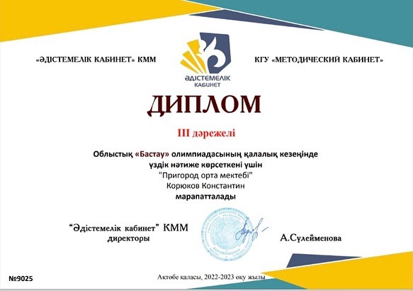 На городском этапе республиканской математической олимпиады для учащихся 2 - 4 классов "Бастау" ученик 4 "Б" класса Корюков Константин занял 3 место. Руководитель: Жылкышиева Алия Турганбаевна